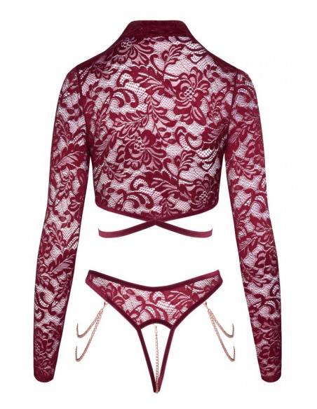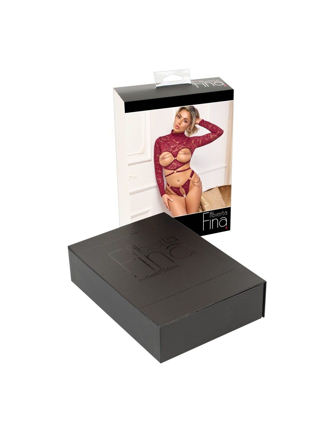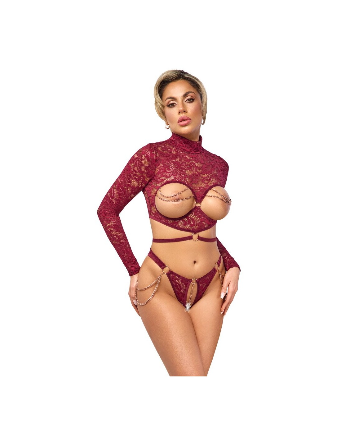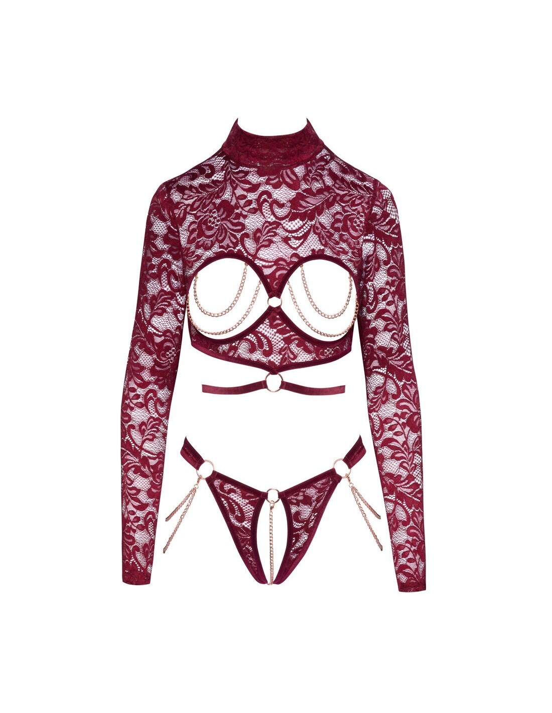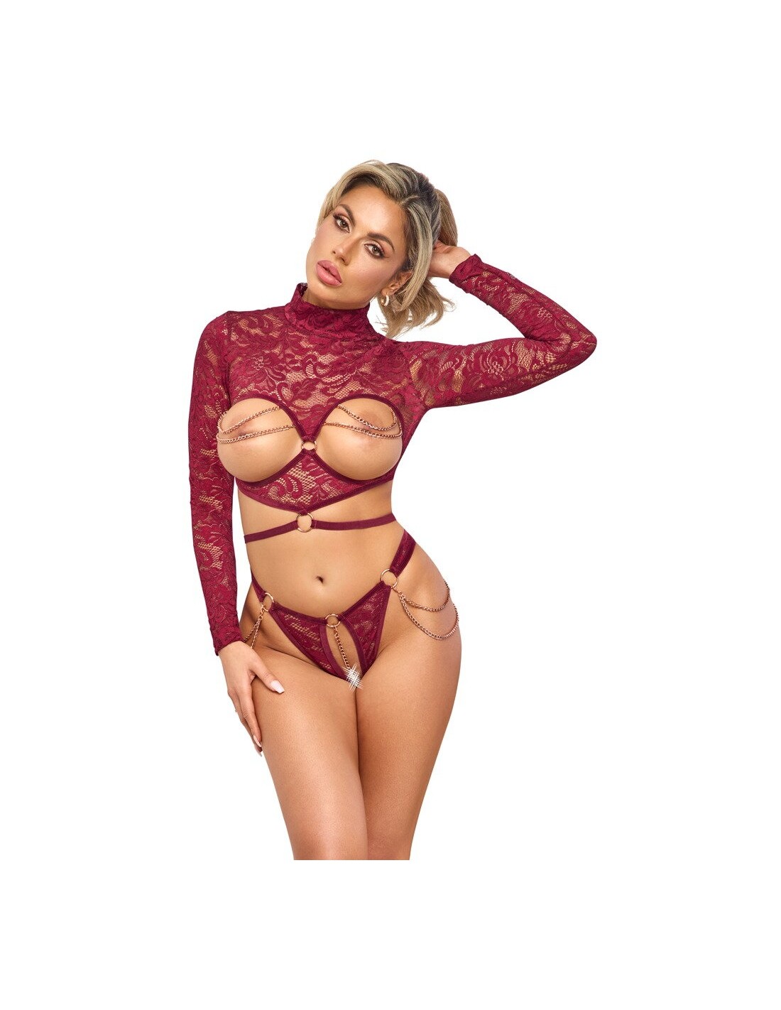 Eccitante set di Abierta Fina con top a maniche lunghe senza busto e perizoma inguinale. Fine pizzo rosso scuro seducente con nastri di velluto e catene e anelli color oro rosa. Morbido ed elastico su tutto il corpo per un elevato livello di comfort. Top morbido con piccolo collo alto e cintura in velluto. Le catene gioiello sul busto esposto possono essere completamente rimosse. Così come le catene doppie sulle cosce e la catena stimolante nel cavallo aperto.