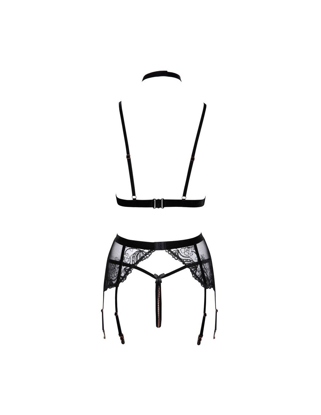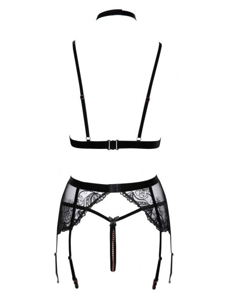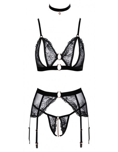 Reggiseno morbido, reggicalze e perizoma inguinale combinati in un set di reggicalze elegantemente erotico di Abierta Fina, con collare in velluto. Set realizzato in pregiato tulle nero, intricatamente ricamato e decorato con piccole paillettes. Gli accessori color oro rosa e le spalline in velluto elasticizzato completano lo stile seducente. Reggiseno con coppe morbide a spacco, chiusura a gancio sulla schiena e spalline in velluto regolabili. Anche il reggicalze ha una chiusura a gancetto sulla schiena e un totale di 6 bretelle regolabili in velluto. La piccola stringa seduce con un cavallo completamente aperto e una catena stimolante, che può anche essere rimossa. Il bellissimo collare di velluto è decorato con un piccolo cuore decorativo e può essere regolato con una chiusura a velcro.