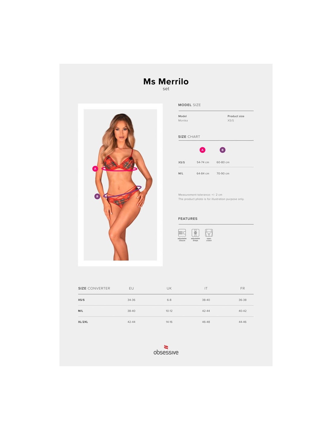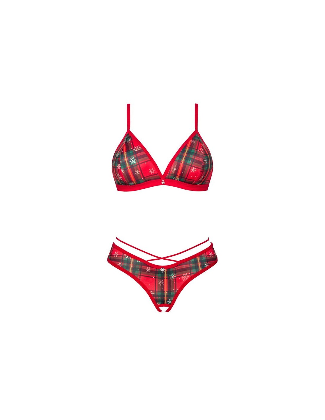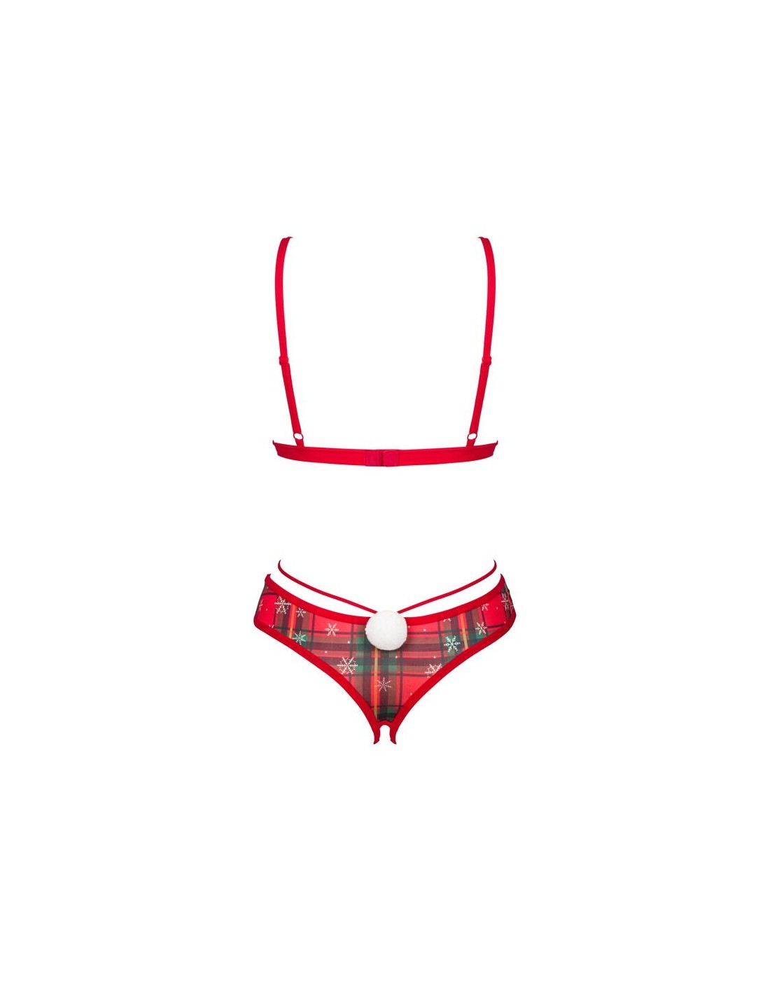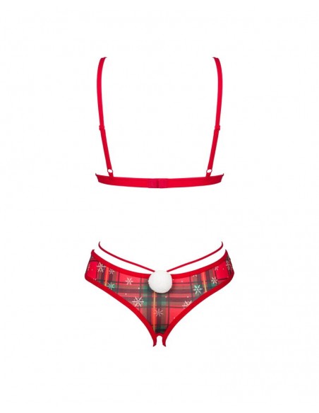 Set di lingerie Ms Merrilo di Obsessive composto da reggiseno e slip senza cavallo. Realizzato in pregiato tulle elasticizzato a quadri con fiocchi di neve bianchi. Morbido ed elasticizzato su tutta la superficie per un elevato comfort. Reggiseno con piccolo gioiello a stella tra le coppe morbide. Le spalline possono essere regolate per adattarsi. Perizoma Rio con elegante cintura a strappo e piccolo pompon di peluche bianco sul sedere. Seducente apertura sul cavallo.