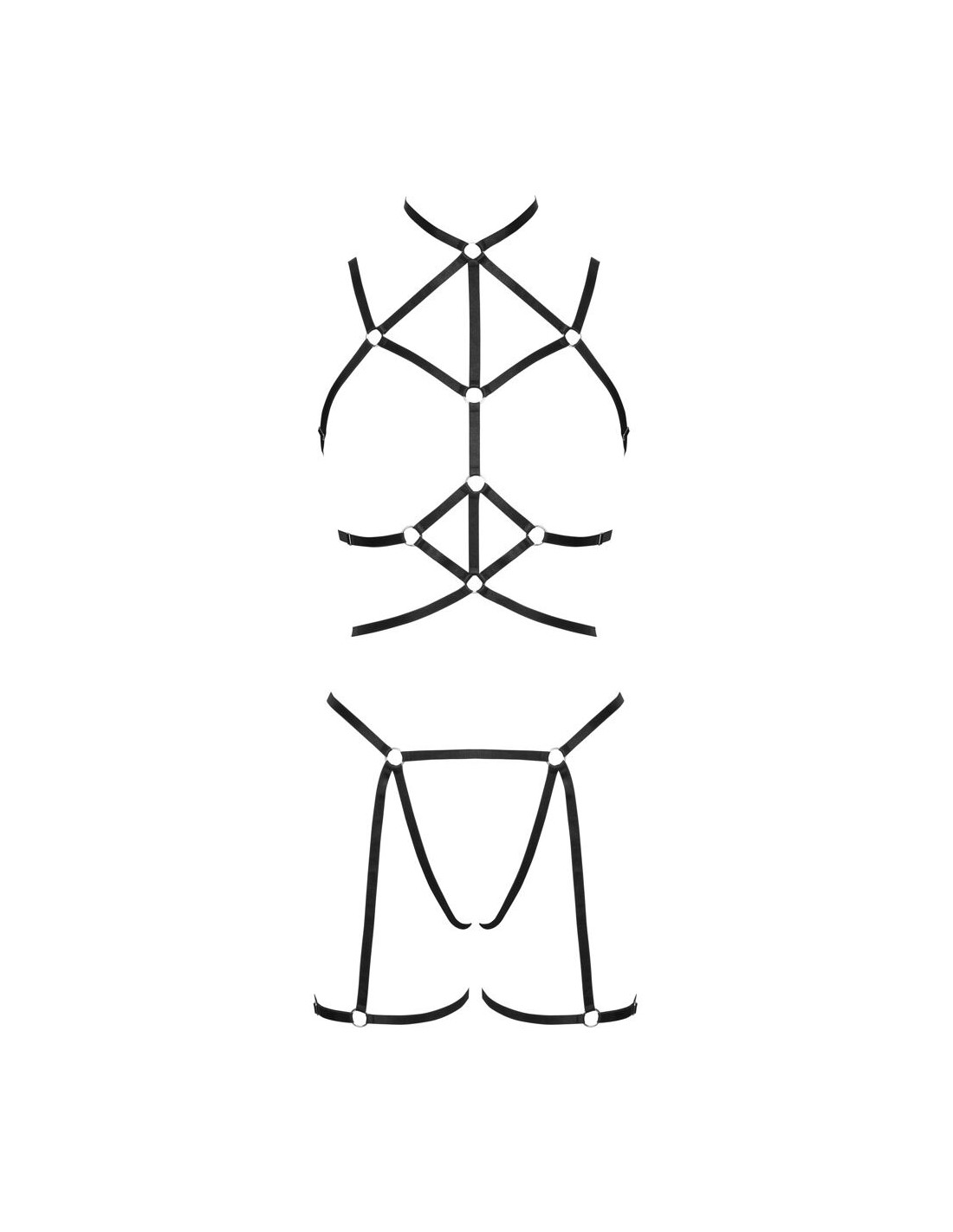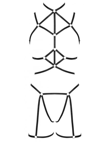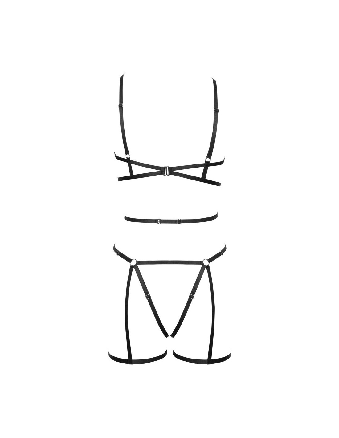 Set di imbracature nere a 3 pezzi di Cottelli LINGERIE con imbracatura per il seno e per i fianchi, compreso un piccolo perizoma. Entrambe le imbracature sono realizzate con cinghie elastiche morbide, setose e lucide e anelli di collegamento color argento. Le cinghie sono multiregolabili per una vestibilità perfetta. Top con chiusura a gancio sul collo e sulla schiena.