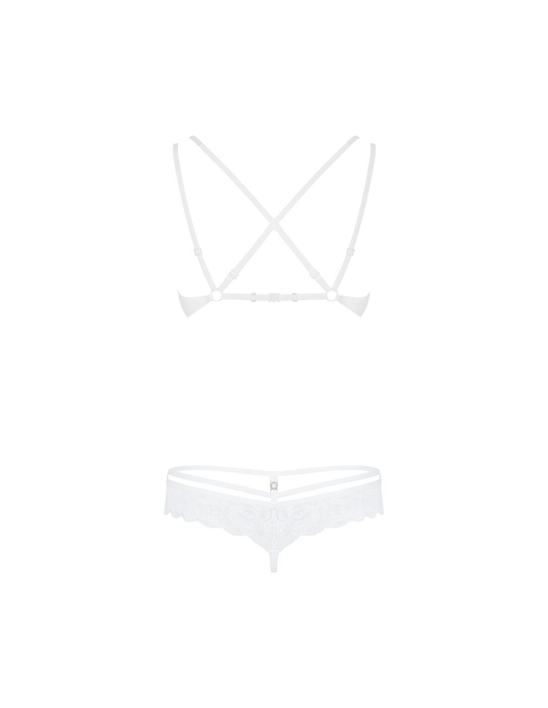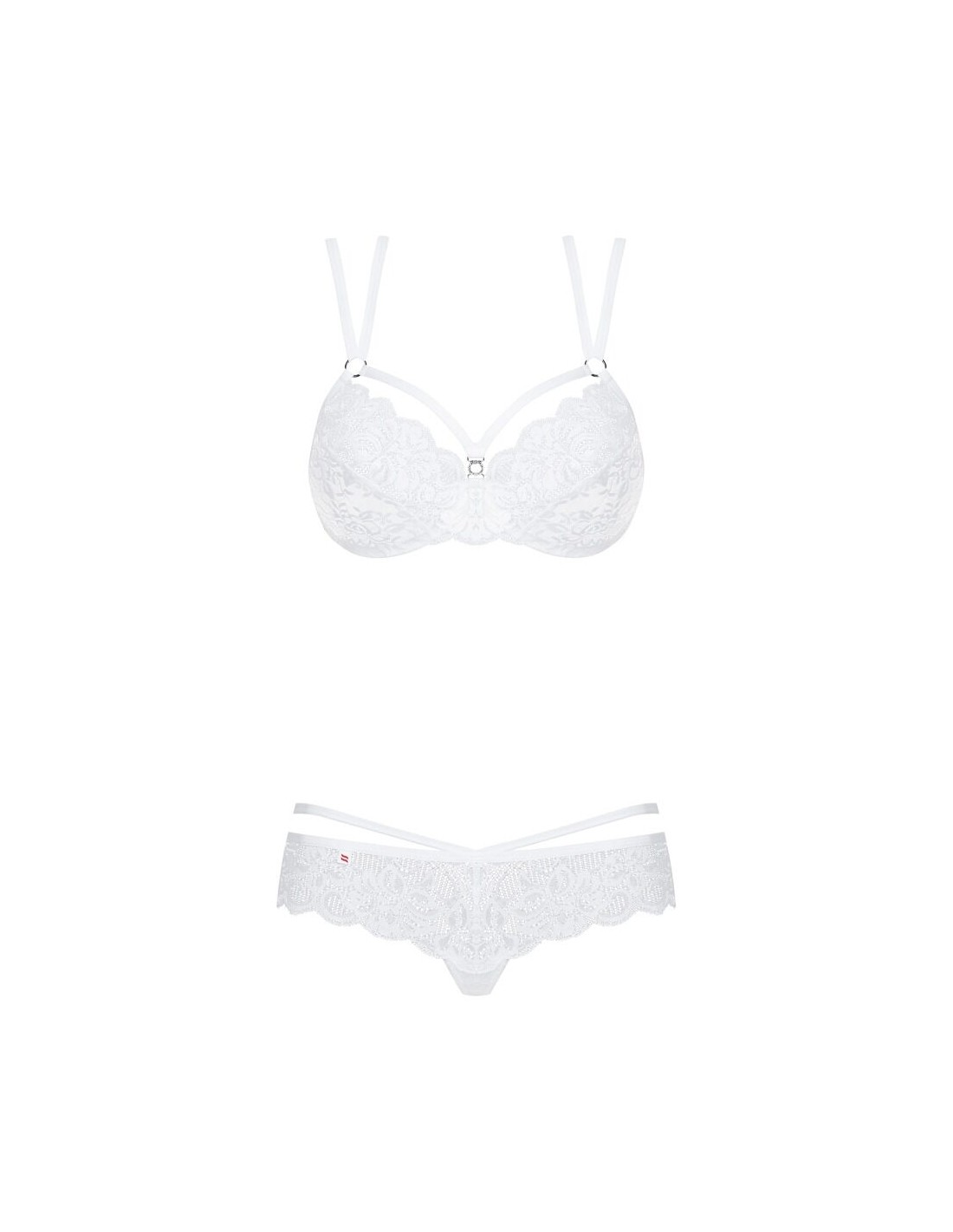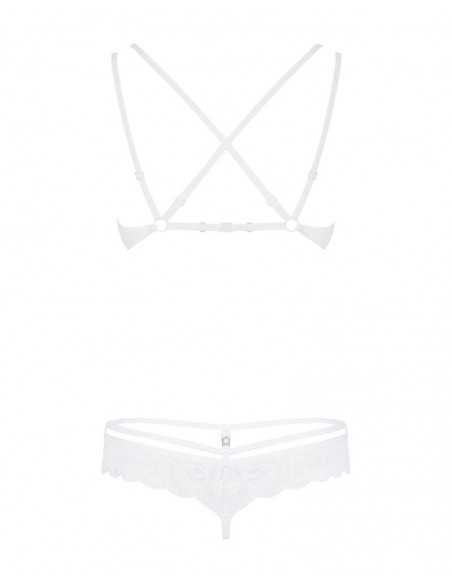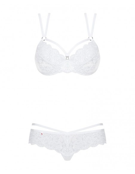 860-SET-2 di Obsessive con reggiseno con ferretto e perizoma in pregiato pizzo floreale bianco. Morbido ed elasticizzato su tutto il corpo per un elevato livello di comfort. Reggiseno con ferretto e coppe con dettaglio gioiello. Le doppie spalline regolabili si incrociano sulla schiena. Il taglio sofisticato del perizoma con laccetti in vita e dettaglio decorativo sottolinea in modo seducente i fianchi e il sedere.
