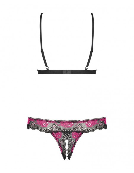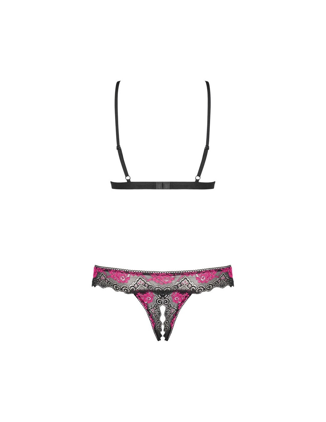 Set crotchless Tulia di Obsessive con reggiseno e perizoma morbidi. Realizzato in bellissimo pizzo bicolore nero e rosa - morbido ed elastico su tutto il corpo per un elevato livello di comfort. Decorato con piccoli fiocchi tra le coppe aperte e sulla fascia in vita del perizoma. Le spalline del reggiseno e la chiusura a gancetto sulla schiena possono essere regolate per adattarsi.