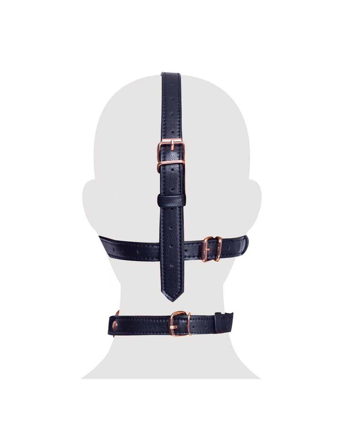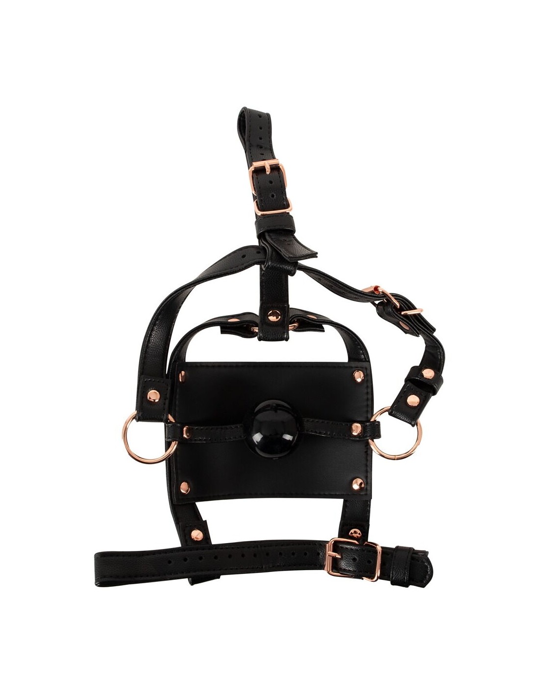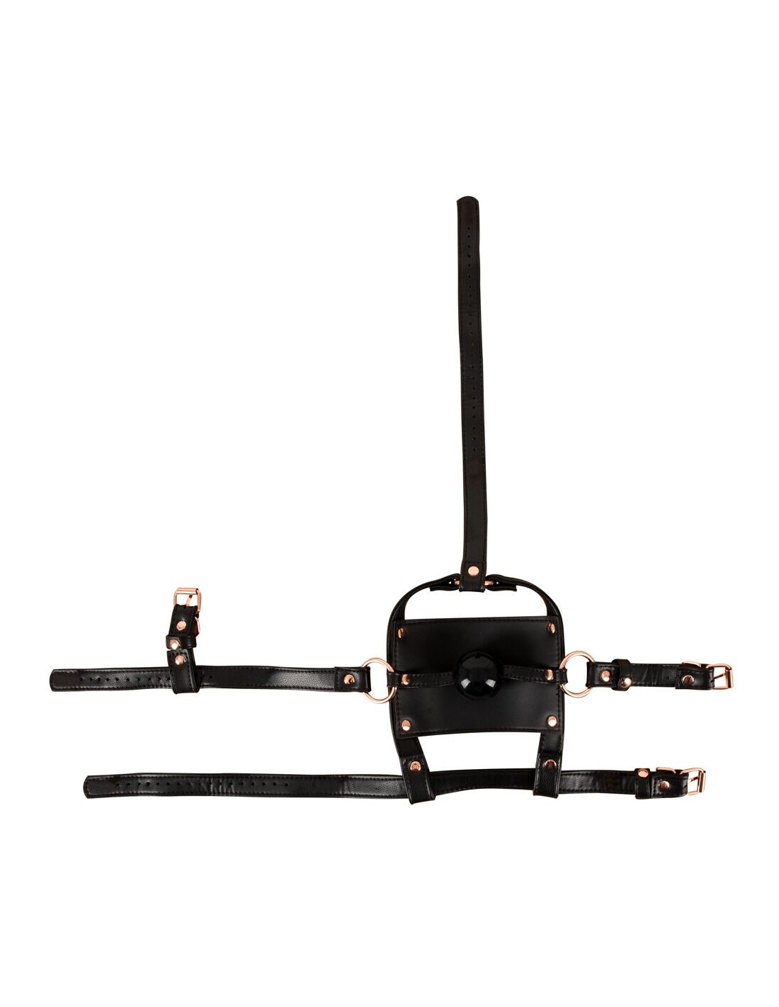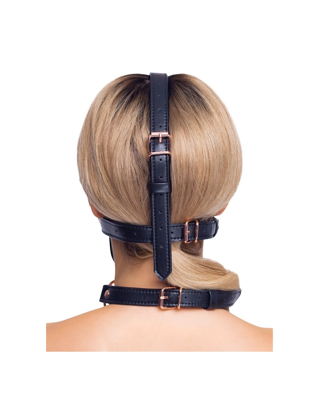 Imbracatura per la testa di alta qualità di Bad Kitty con bavaglio rotondo a prova di morso (Ø 4 cm). In elegante pelle con dettagli in metallo color oro rosa. Regolazioni multiple con fibbie di chiusura per una vestibilità ottimale.