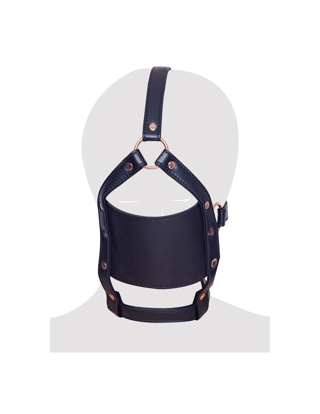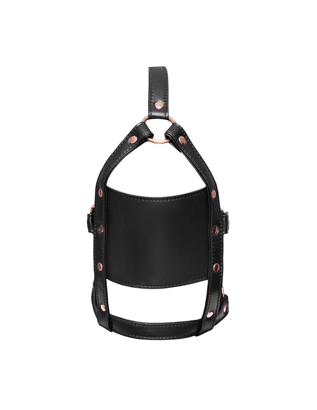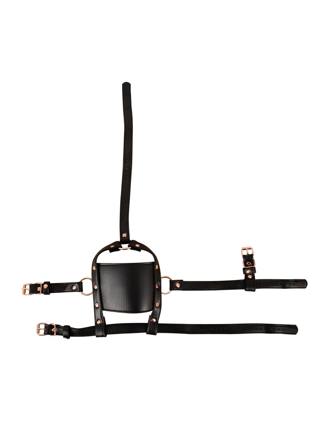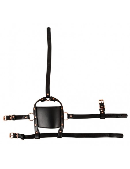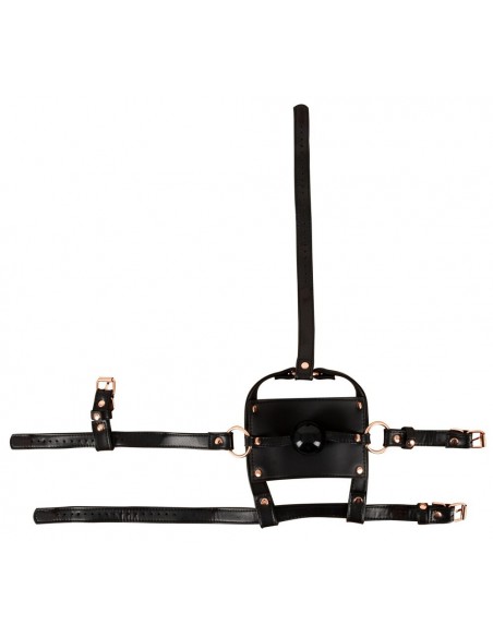 Imbracatura per la testa di alta qualità di Bad Kitty con bavaglio rotondo a prova di morso (Ø 4 cm). In elegante pelle con dettagli in metallo color oro rosa. Regolazioni multiple con fibbie di chiusura per una vestibilità ottimale.