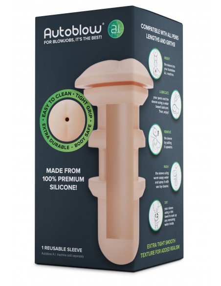 Il sistema di manicotti intercambiabili di Autoblow A.I. ti permette di trasformare il tuo masturbatore in una vera e propria macchina del sesso, semplicemente sostituendo i manicotti. Goditi una fantasia anale sostituendo i manicotti a forma di bocca o di vagina con questo manicotto realistico e stretto a forma di ano. Tutti i manicotti di Autoblow A.I. sono completamente realizzati in silicone, il che significa che ti daranno la sensazione della carne vera. Inoltre, sono privi di porosità, completamente inodore e fatti per durare a lungo. Autoblow A.I. è l’unico gioco per uomini adulti che utilizza manicotti al 100% in silicone, e ti accorgerai immediatamente della differenza. Buon divertimento!