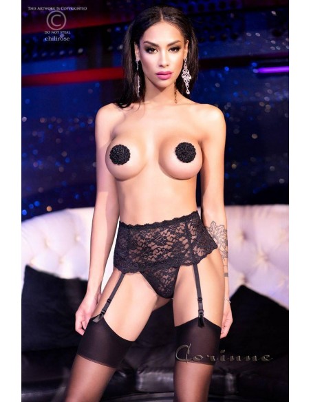Reggicalze e tanga in pizzo floreale nero + calze. M