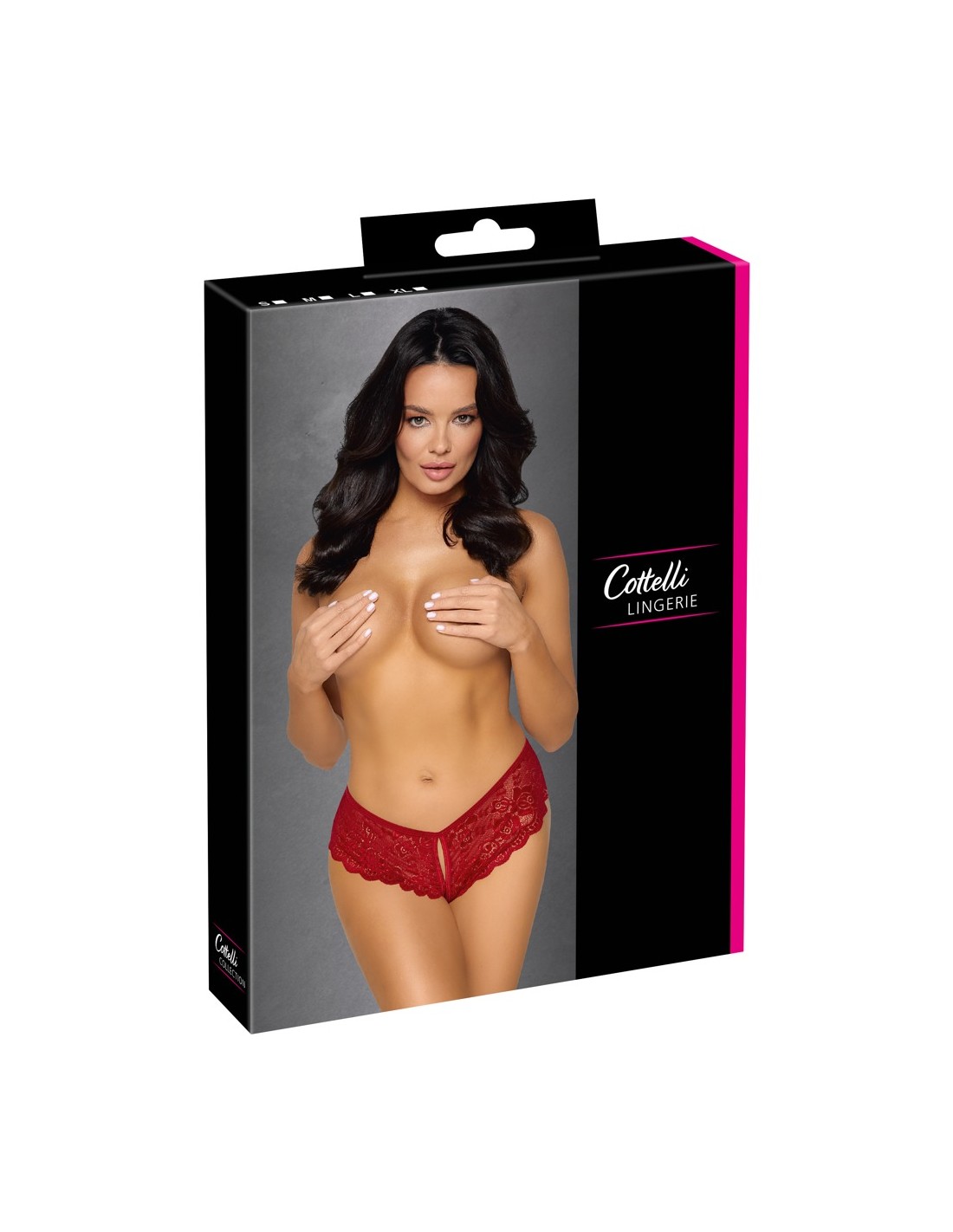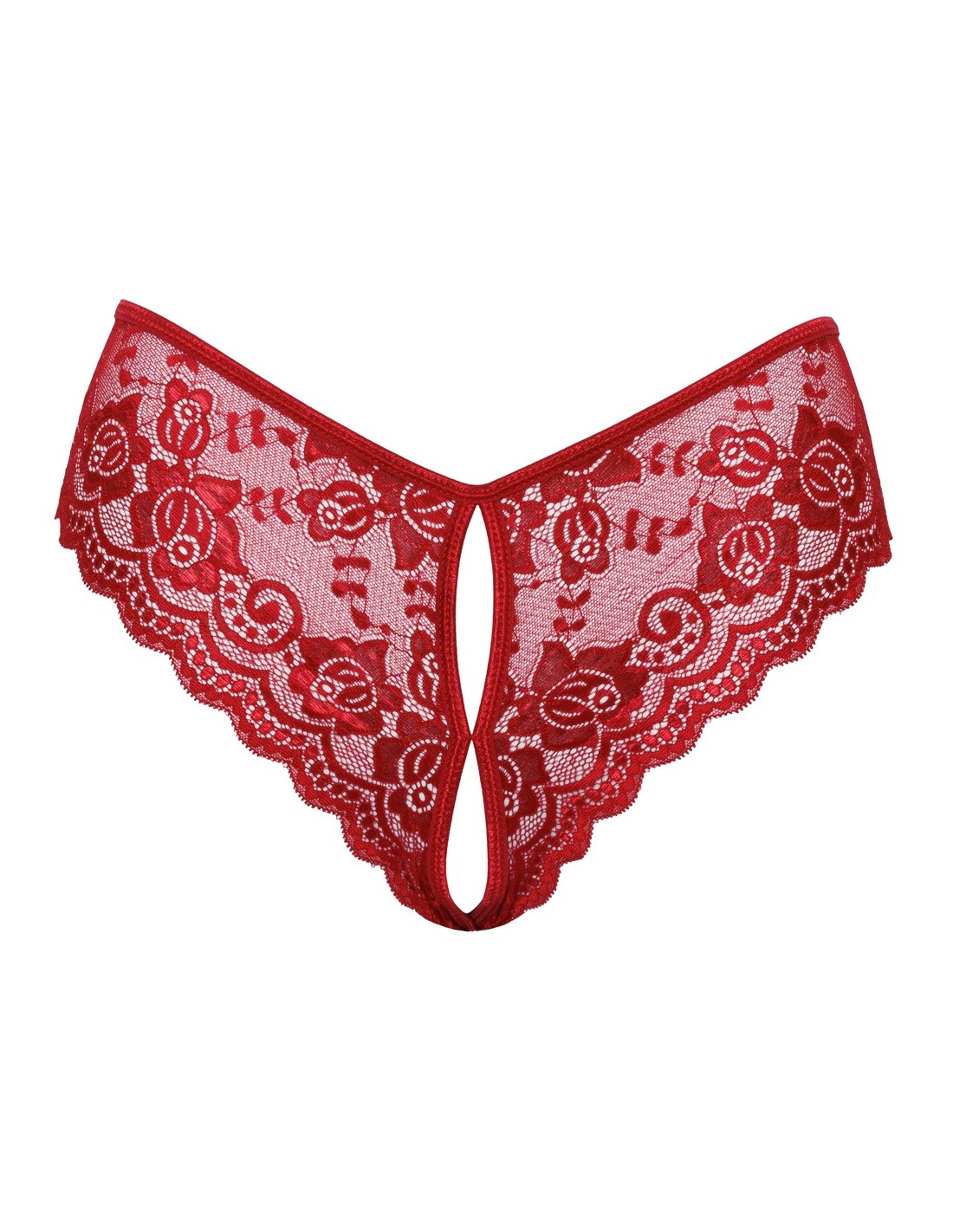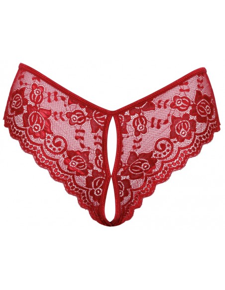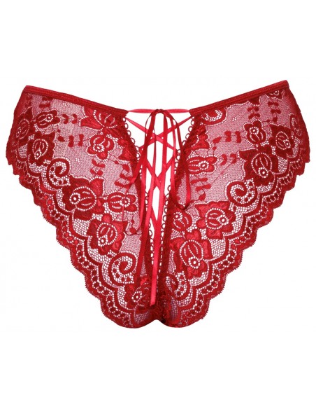 Mutandine senza cavallo riccamente realizzate di Cottelli LINGERIE realizzate in pizzo floreale rosso. Morbido ed elastico per un elevato comfort. Con apertura frontale e cavallo invitante. Con allacciatura variabile in nastro di raso sopra i glutei.