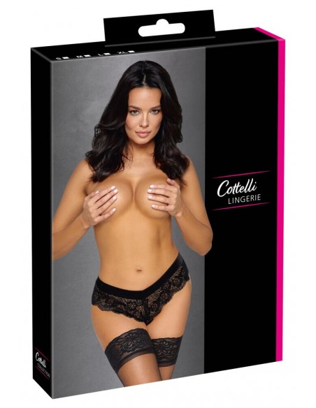 Mutandine di Cottelli LINGERIE realizzate interamente in pizzo pregiato con una fascia in vita di morbido velluto. Morbido ed elastico su tutto il perimetro per un elevato comfort di utilizzo. Nel cavallo una catena stimolante che può essere rimossa da un lato con un piccolo moschettone