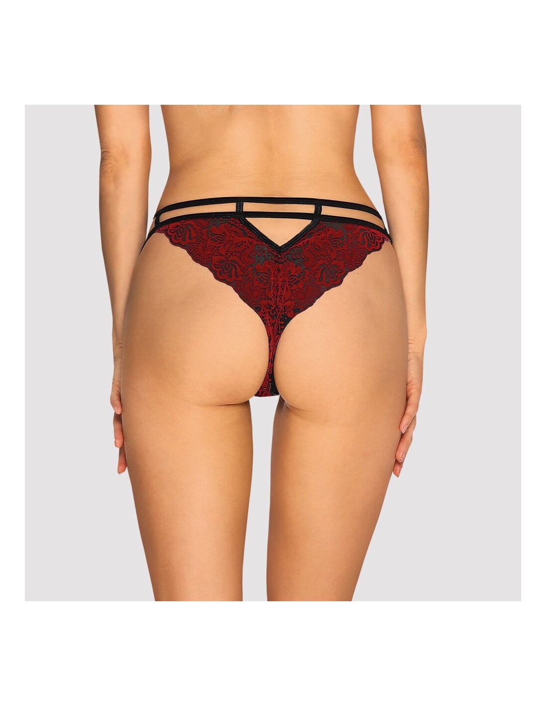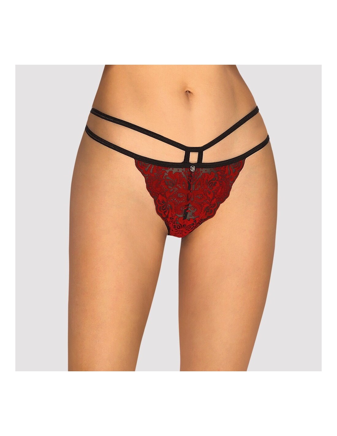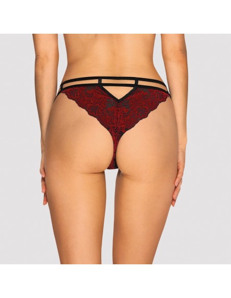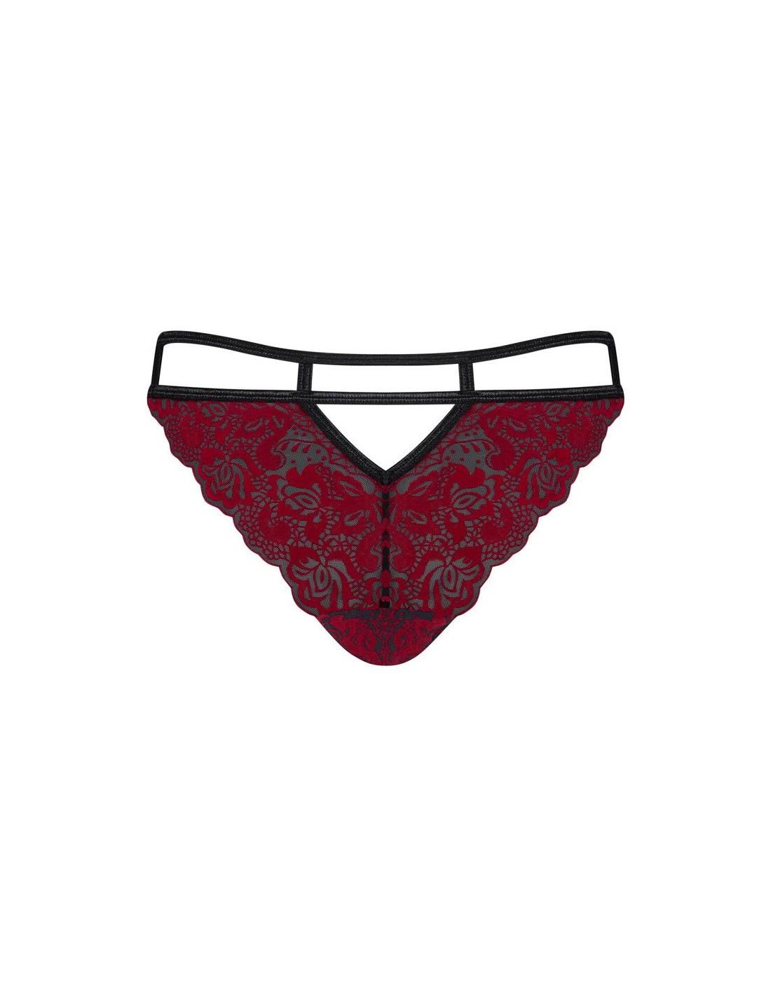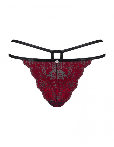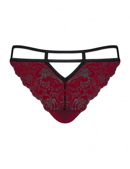 Perizoma dal taglio seducente Sugestina di Obsessive in trasparenza nera con applicazioni in velluto filigranato rosso scuro. Morbido ed elastico per un comfort totale. Doppio cinturino elastico in vita con un piccolo elemento metallico sul davanti e un piccolo cut-out sul retro.