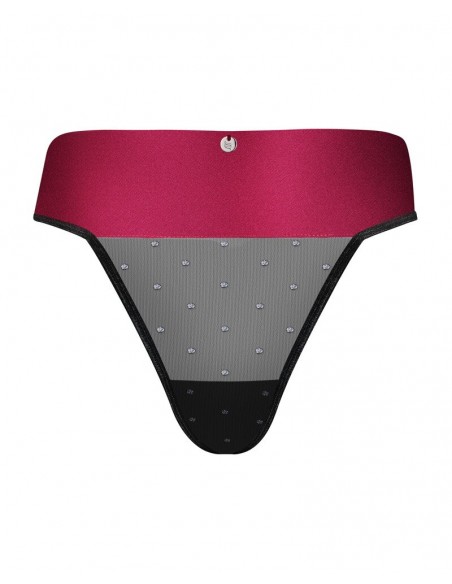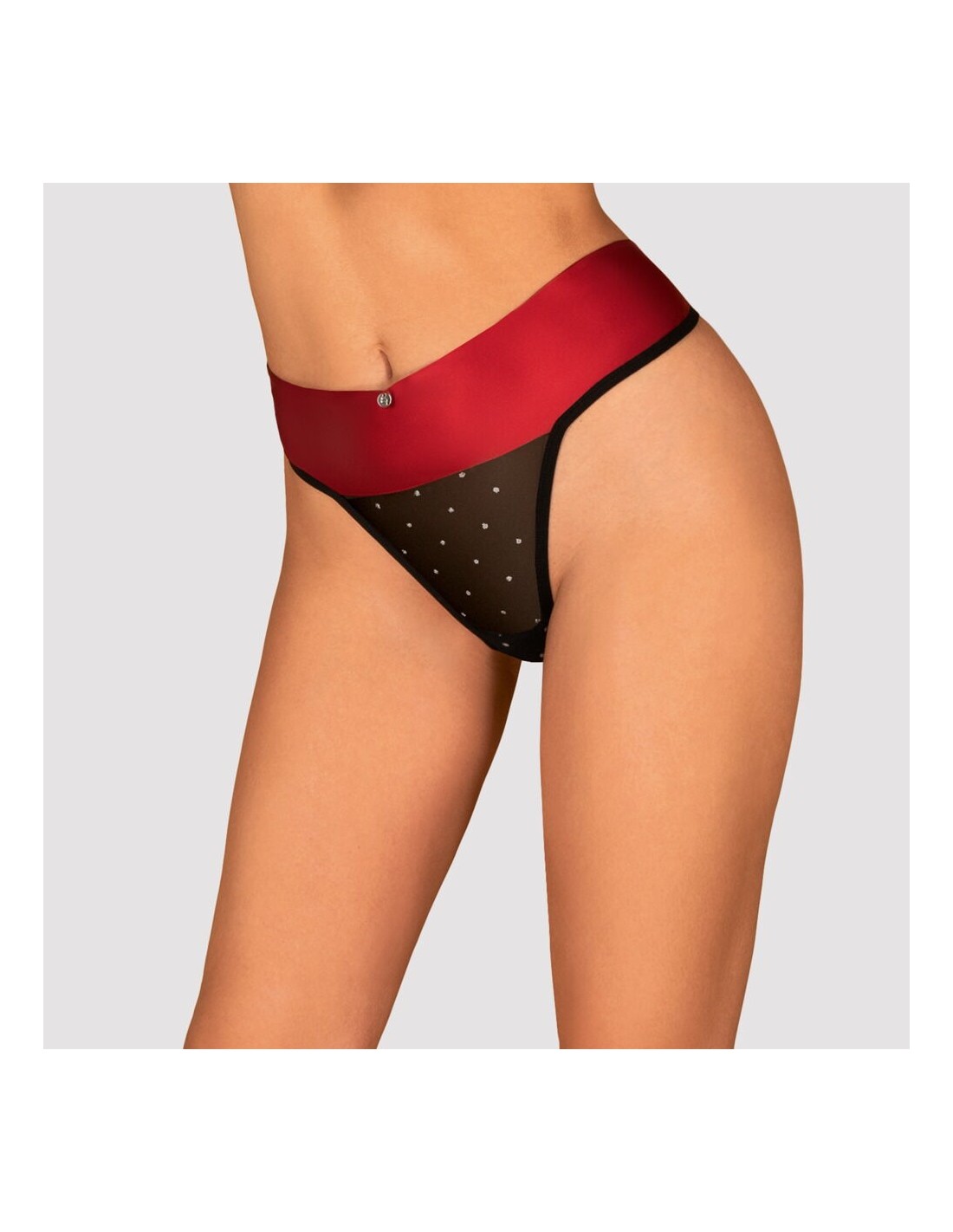 Perizoma a vita alta di Obsessive in sottile e morbido tulle trasparente con pois scintillanti. Ampia fascia in vita in raso rosso con un grande fiocco da annodare sul sedere. Piccolo elemento gioiello sul davanti della cintura.