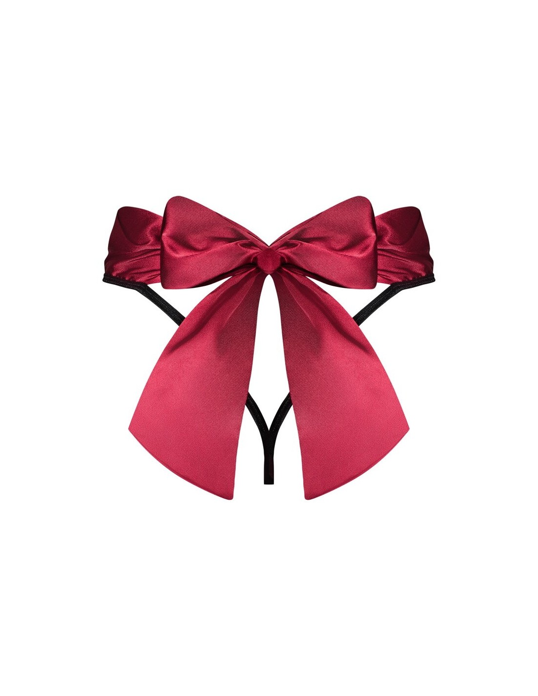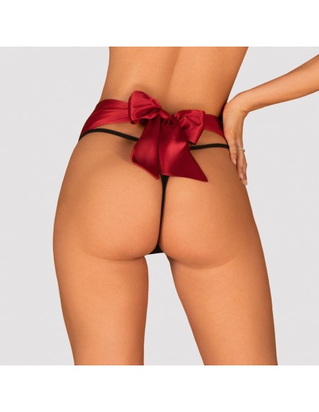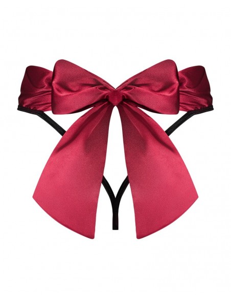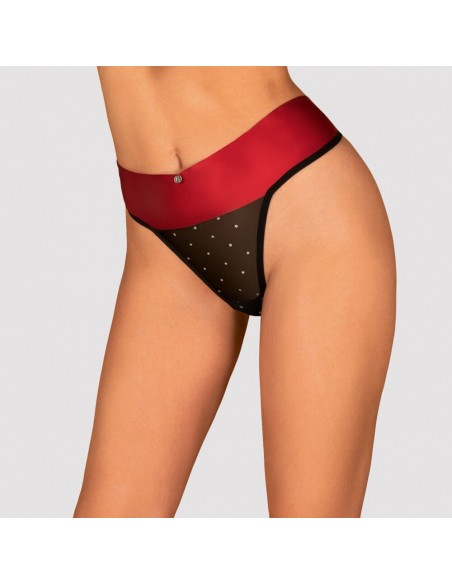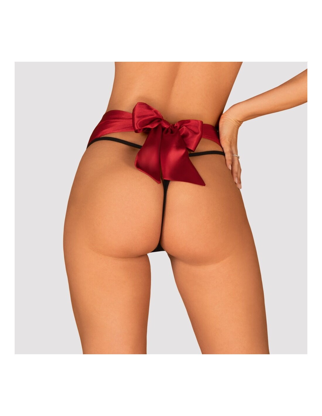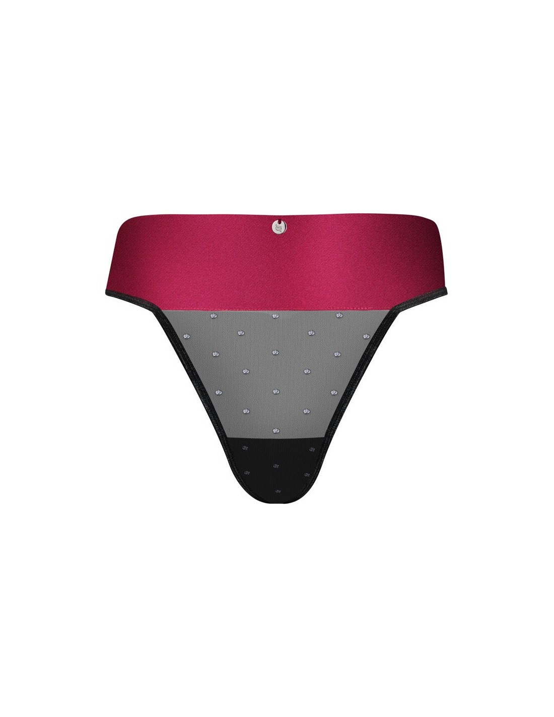 Perizoma a vita alta di Obsessive in sottile e morbido tulle trasparente con pois scintillanti. Ampia fascia in vita in raso rosso con un grande fiocco da annodare sul sedere. Piccolo elemento gioiello sul davanti della cintura.