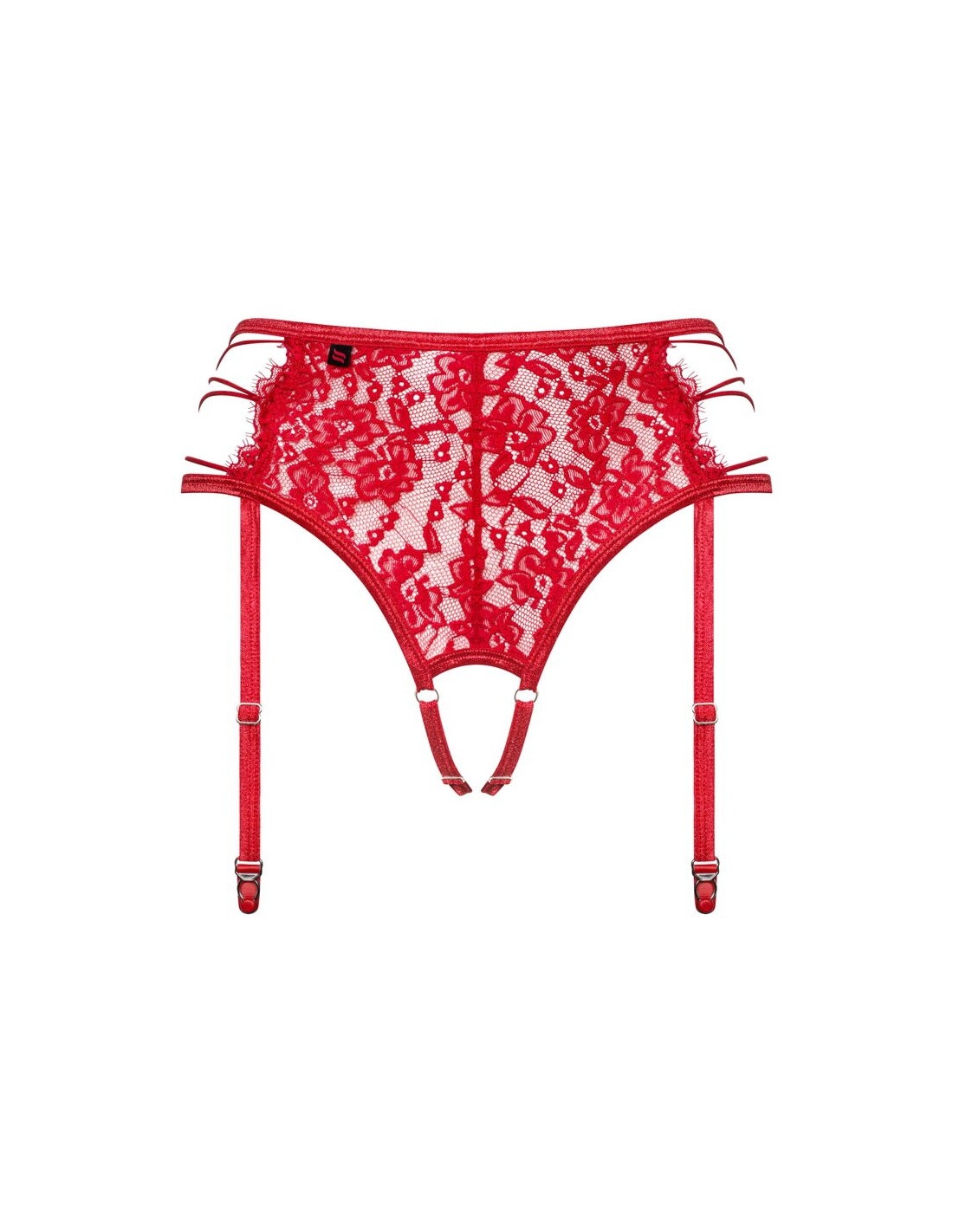 Perizoma reggicalze rosso Rediosa di Obsessive in morbido pizzo elasticizzato. Lati aperti con cinghie elastiche in un look decorativo con lacci. Le bretelle regolabili sono saldamente cucite sul perizoma. I laccetti possono essere regolati anche sul cavallo aperto per una vestibilità perfetta.