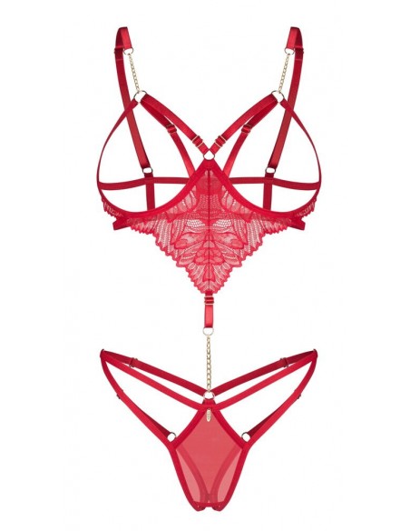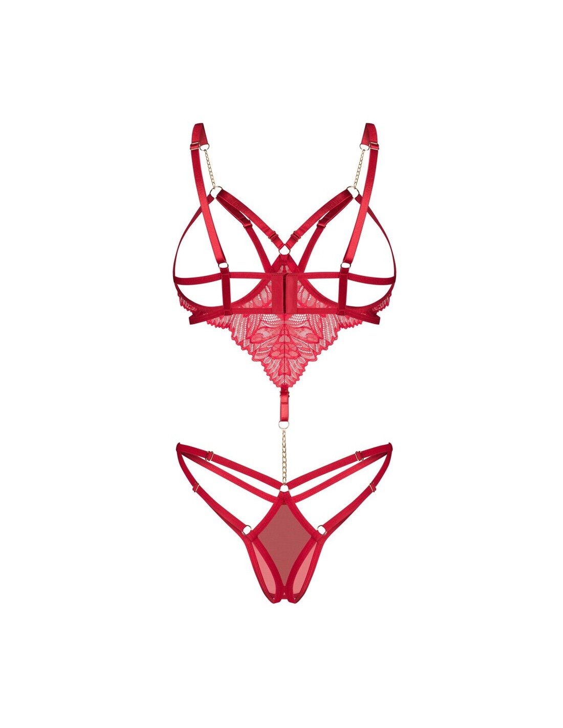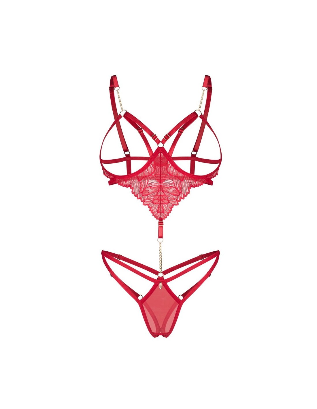 Body crotchless Matildea di Obsessive in rosso intenso con pizzo fine e dettagli decorativi color oro. Morbido ed elastico per un elevato livello di comfort. Eccitante senza seno e seducente aperto all'inguine. Con catene sulle spalline regolabili sul davanti e come elegante combinazione di reggiseno e perizoma. Look a due pezzi sul retro con chiusura a gancio regolabile. Le spalline regolabili delle coppe incorniciano perfettamente il seno scoperto. Un piccolo gioiello sul davanti del perizoma è un dettaglio allettante. Anche le spalline del perizoma sono regolabili, in modo che tutto si adatti perfettamente.