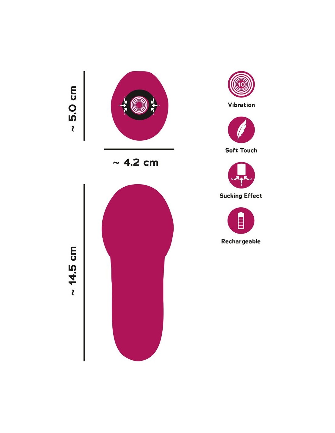 Il silenzioso vibratore Oral Fun inizia il suo eccitante gioco con la semplice pressione di un pulsante. Le modalità di aspirazione e vibrazione possono essere controllate separatamente e combinate tra loro. Divertimento orale personalizzato per clitoride, vulva, capezzoli, ano e altre zone erogene. Il toy, leggero ed ergonomico, si adatta perfettamente alla mano e può essere utilizzato in modo intuitivo. Il silicone morbido come la seta accarezza la pelle e i punti caldi e garantisce il massimo comfort durante le coccole.