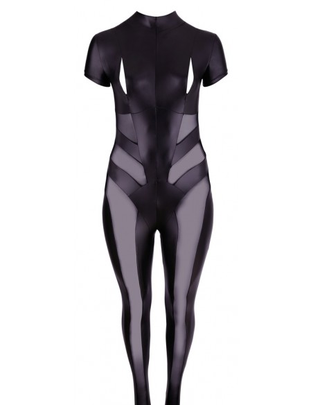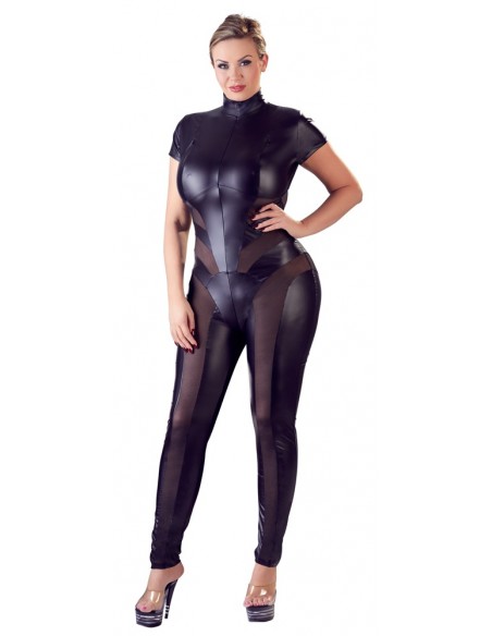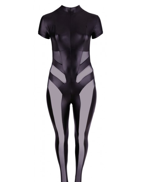 Tuta a forma di figura in look opaco, abbinata a sofisticati inserti in rete sul fronte, sui lati e sul retro. Con collo alto, manica corta e gamba lunga. Le cerniere lampo sopra i seni espongono i capezzoli in modo stuzzicante. Una cerniera continua a 2 vie nella parte anteriore fino a sopra il fondo rende il look sexy perfetto.