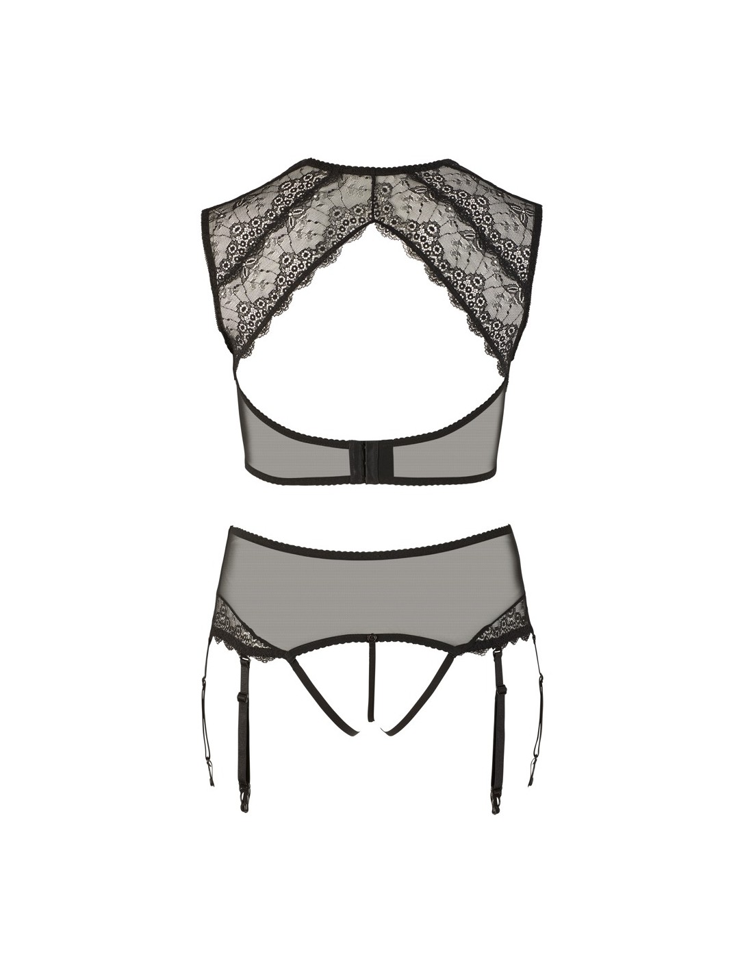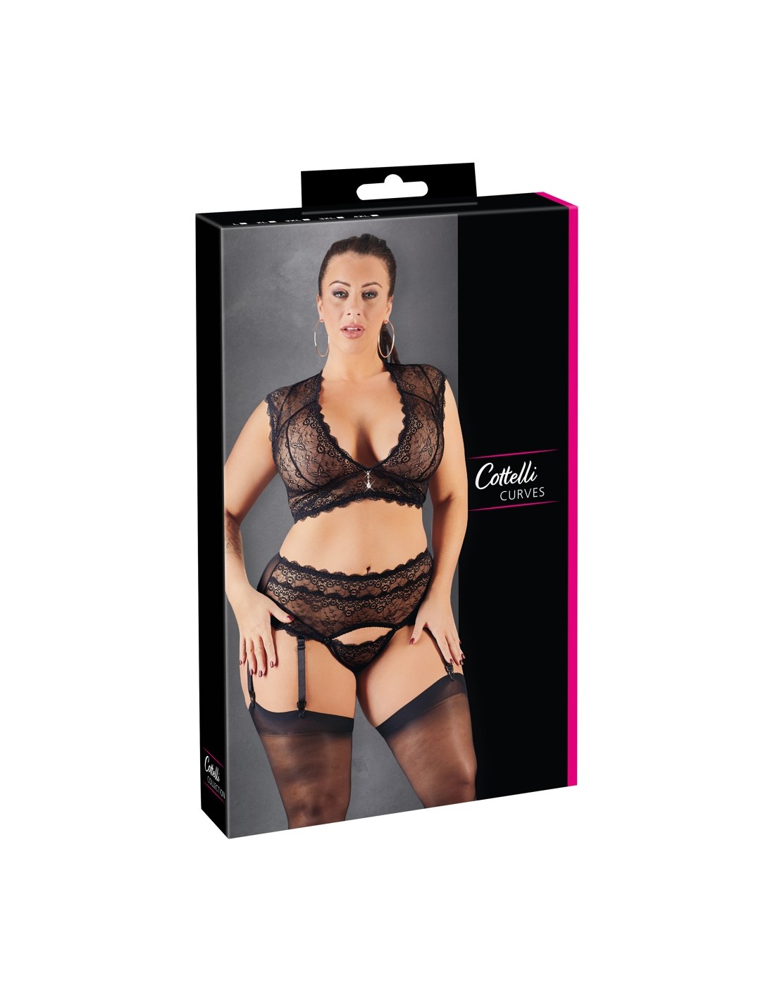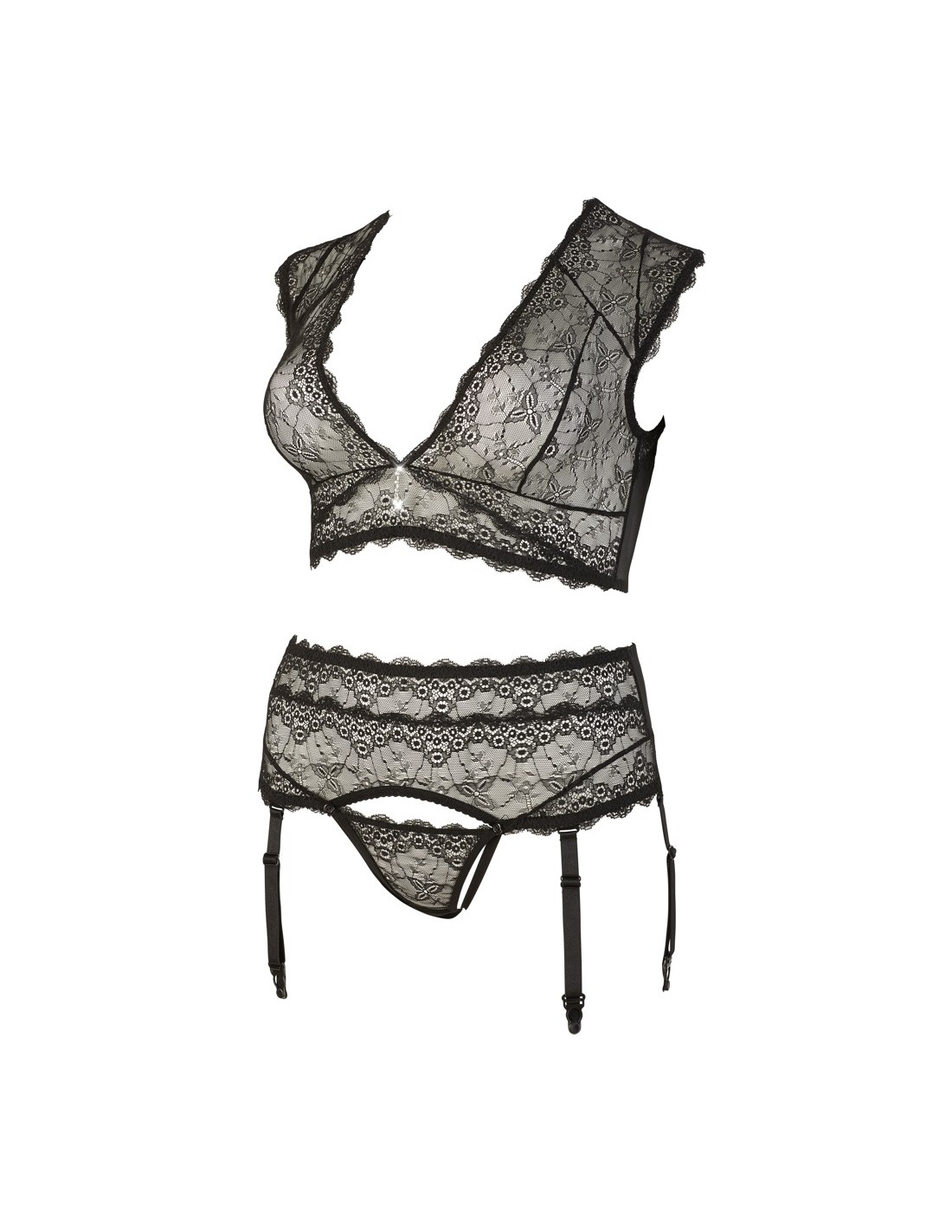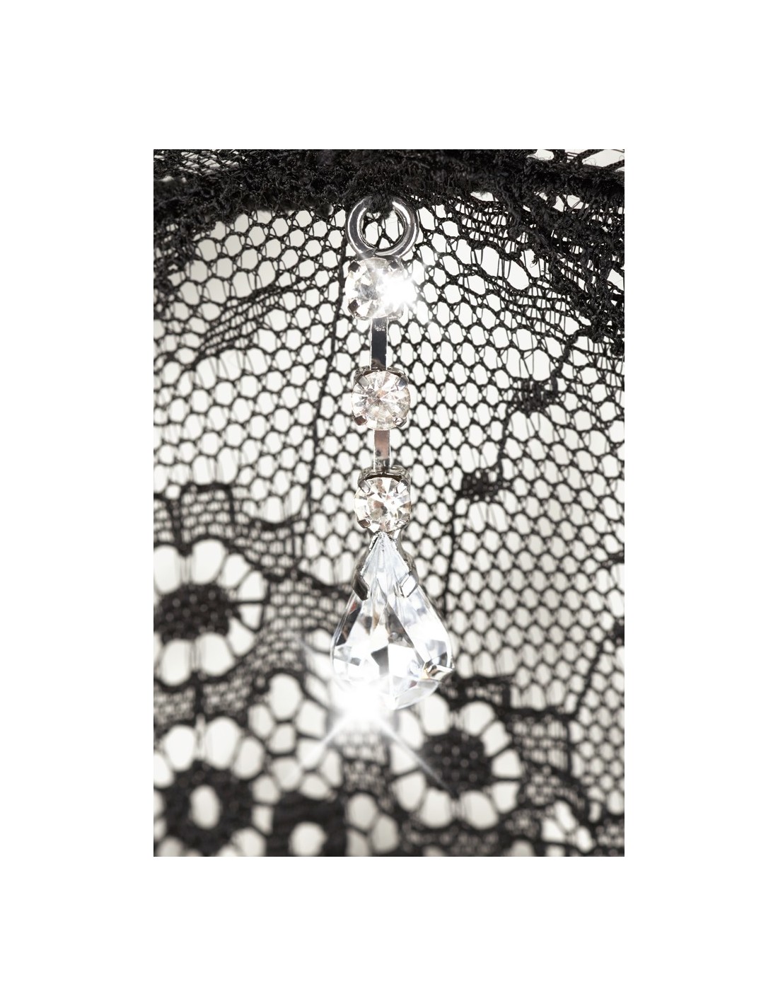 Bralette e reggicalze in morbido pizzo elastico misto a powernet. Bralette con elemento di strass nella scollatura extra profonda e chiusura a gancio nella parte posteriore. Perizoma con 6 bretelle regolabili e rimovibili e parte del perizoma staccabile, in modo che solo 2 elastici passino attraverso il cavallo al lato.