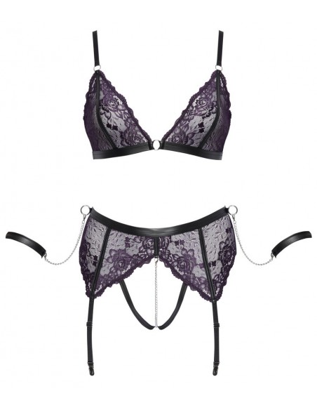 Set di reggicalze Cottelli BONDAGE con reggiseno morbido, reggicalze senza cavallo e due polsini morbidi per le braccia. Delicato pizzo viola scuro con dettagli neri opachi e anelli e catene color argento. Reggiseno con coppe morbide, spalline regolabili e chiusura a gancio regolabile sulla schiena. Come il reggicalze con bretelle regolabili. Cavallo completamente aperto con catena stimolante rimovibile. Le cavigliere con catene a moschettone possono essere agganciate agli anelli ai lati della cintura alta. Le morbide cavigliere possono essere indossate e tolte rapidamente grazie alle loro chiusure in velcro regolabili.