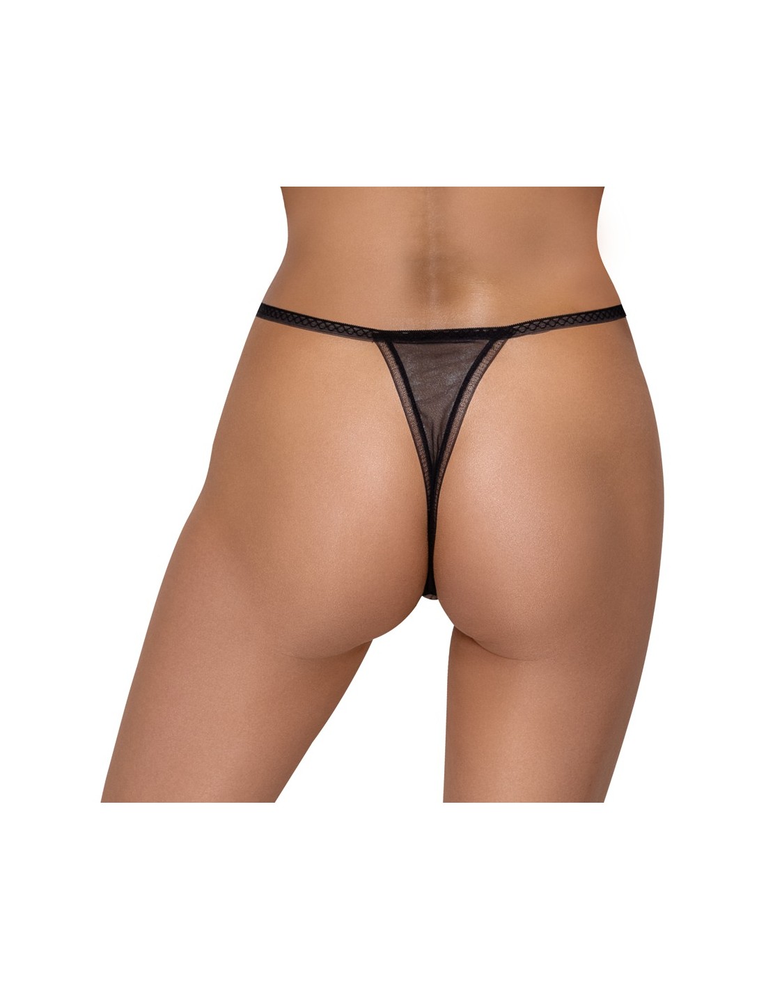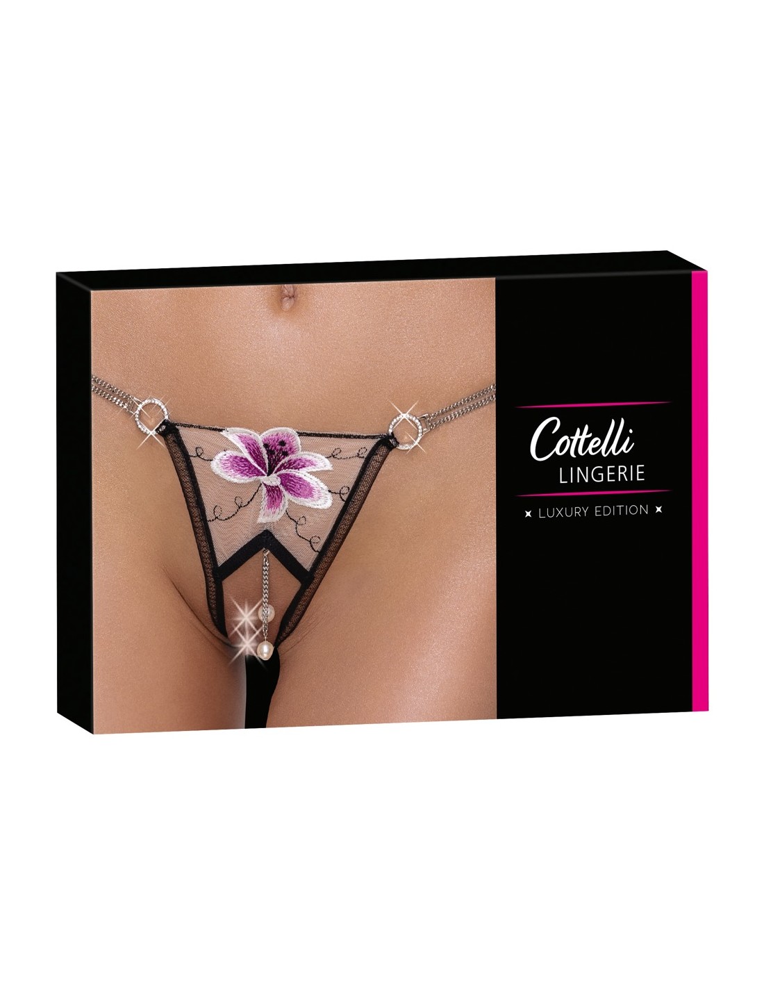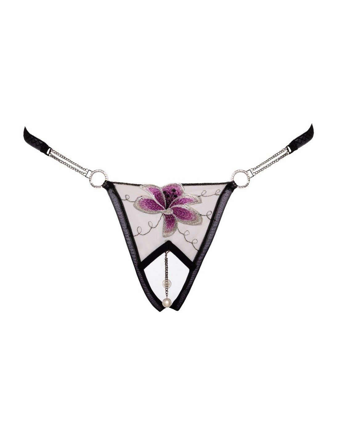 Perizoma inguinale di Cottelli LINGERIE in fine rete di tulle con un bel fiore e un delicato ricamo sul seducente davanti aperto. 2 catenelle oscillanti con perle decorano e stimolano - ma sono anche completamente rimovibili. Cintura elastica sul davanti con 2 catene di strass e anello su ogni lato. Inserto elastico in powernet sul retro per una vestibilità sicura.