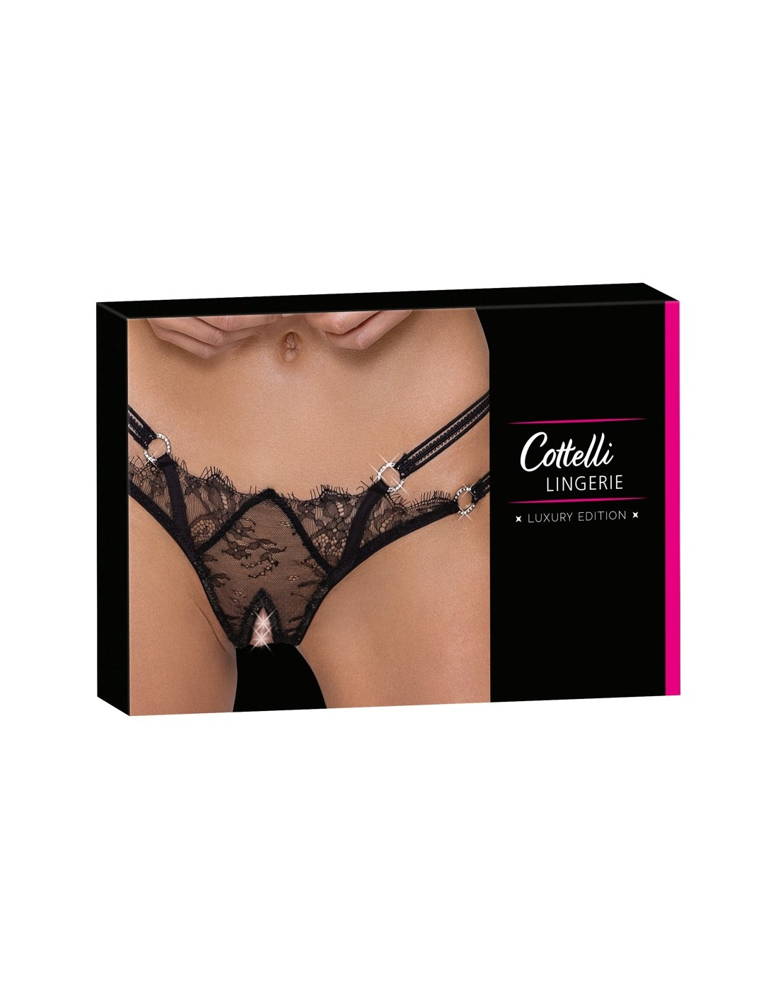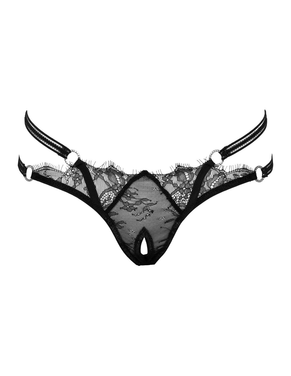 Perizoma Rio di Cottelli LINGERIE in delicato pizzo a ciglia parzialmente sovrapposte. Fascia elastica elaborata a doppia vita con 4 anelli di strass iridescenti. Inserto elasticizzato sul retro per una vestibilità perfetta e confortevole. Aperta in modo invitante sul cavallo.