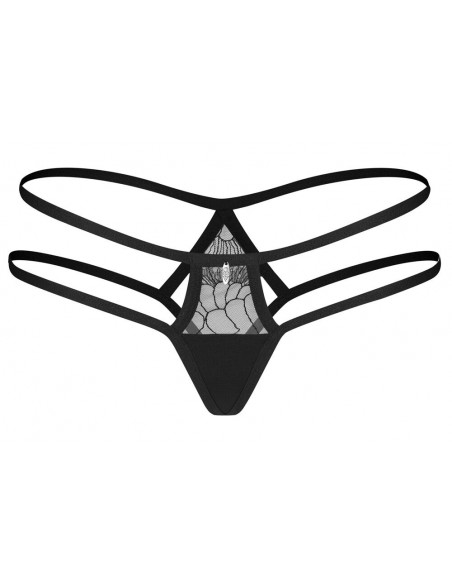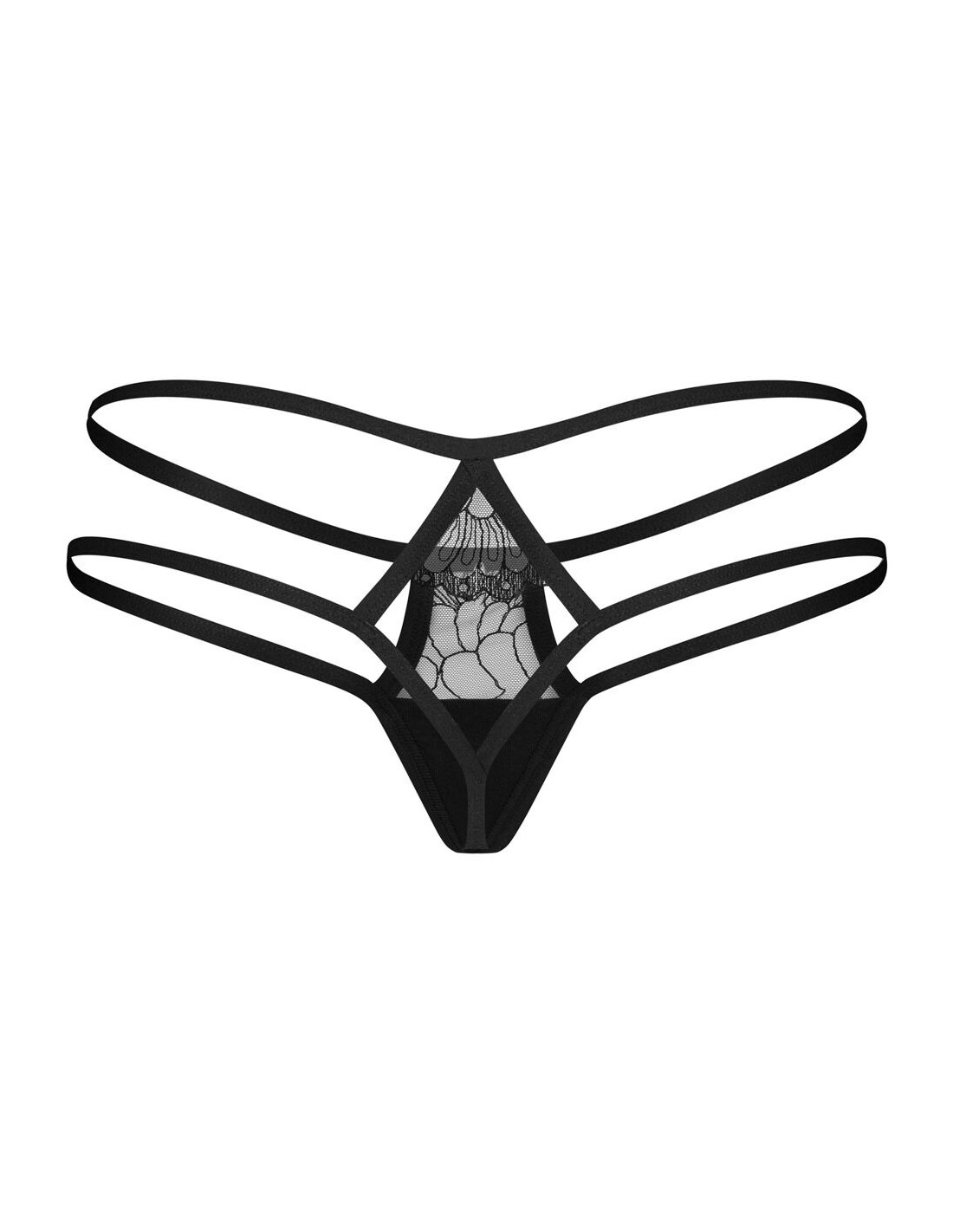 Perizoma Arrowel nero di Obsessive con pizzo fine e piccolo gioiello sul davanti. Elegante cintura elasticizzata a doppio strato in vita.