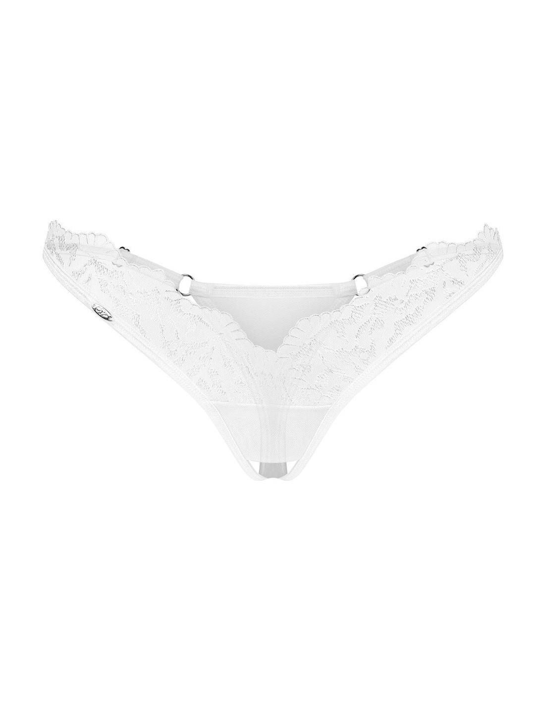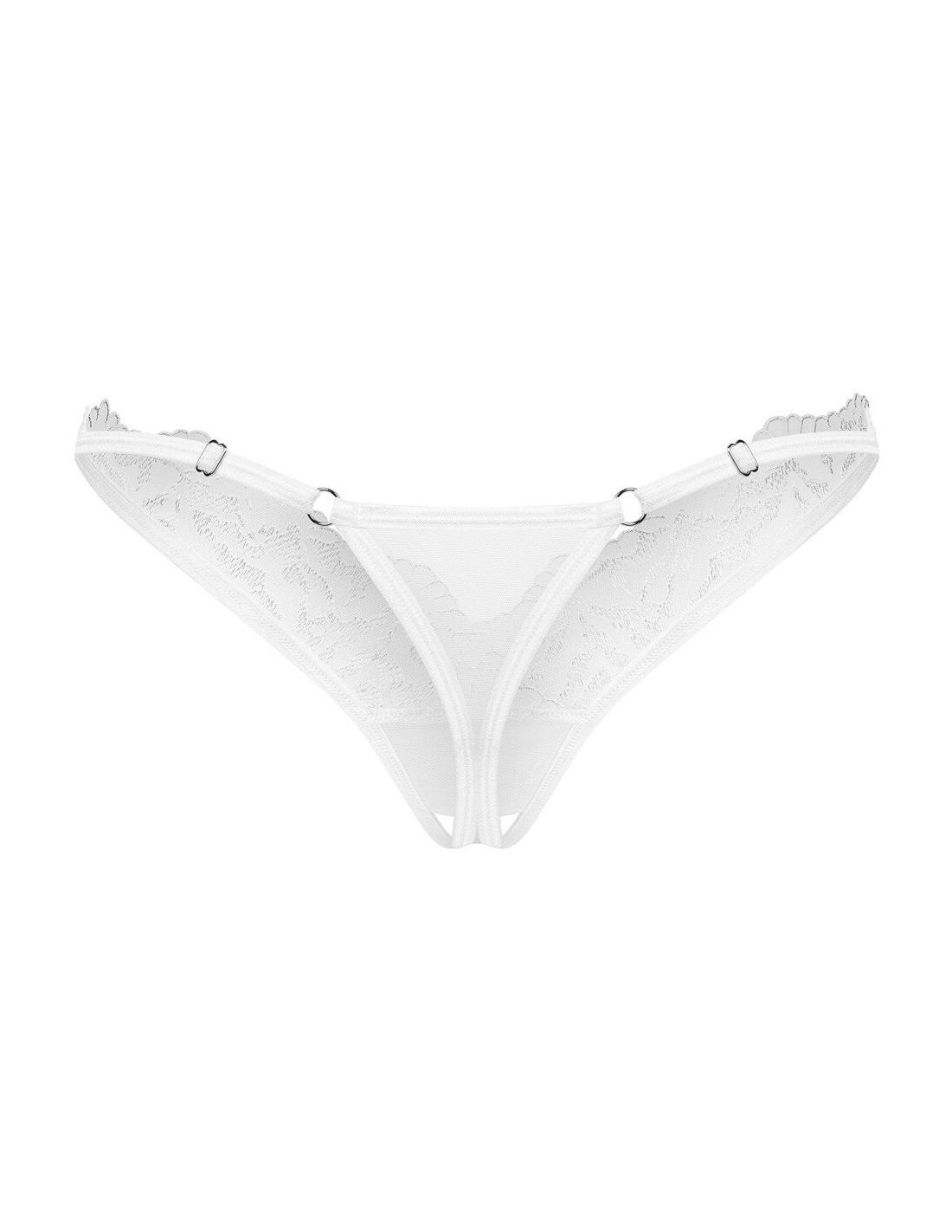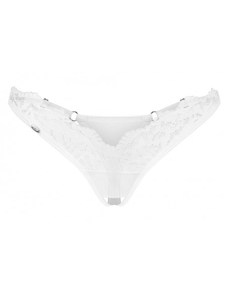 Bellissimo perizoma crotchless Arrowel di Obsessive in tulle bianco trasparente con pizzo sottile sul davanti. Morbido ed elastico per un alto livello di comfort. Invitante apertura sul cavallo.