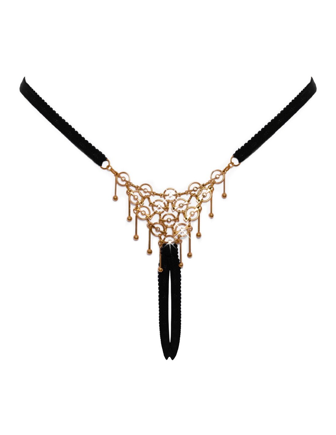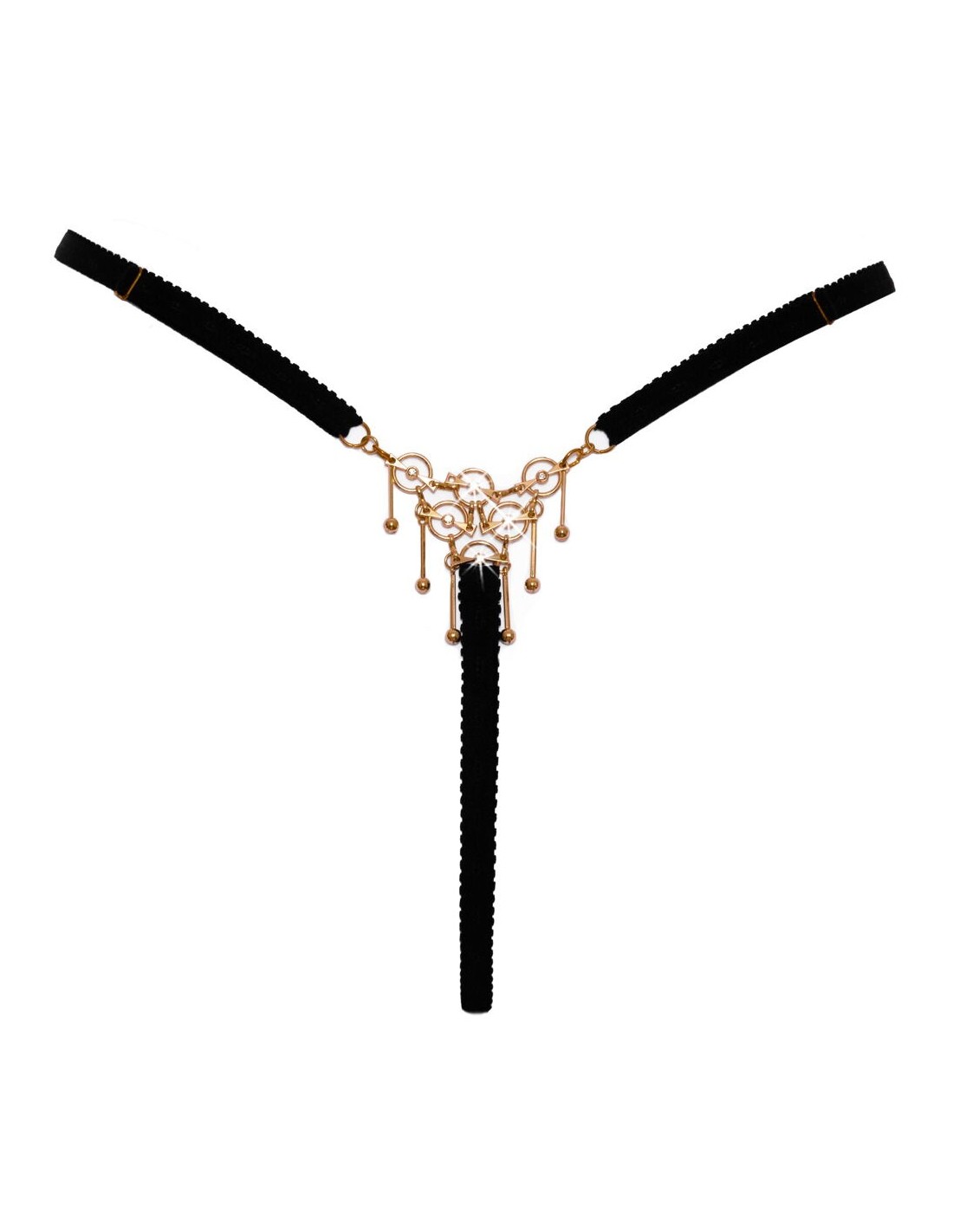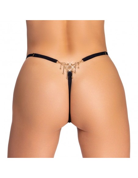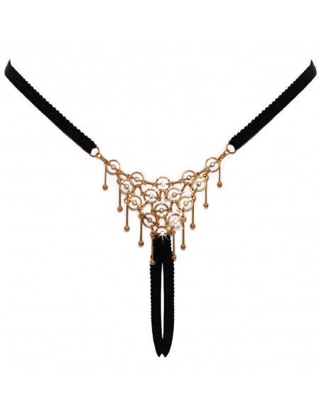 Lussuoso perizoma nero senza cavallo di Cottelli LINGERIE, realizzato con nastri morbidi e molto elasticizzati. Sia il triangolo anteriore che quello posteriore sono realizzati in maglia filigranata color oro bianco con anelli, borchie a sfera oscillanti, catene e pietre scintillanti. Regolabile ai lati della cintura. Seducente apertura sul cavallo.