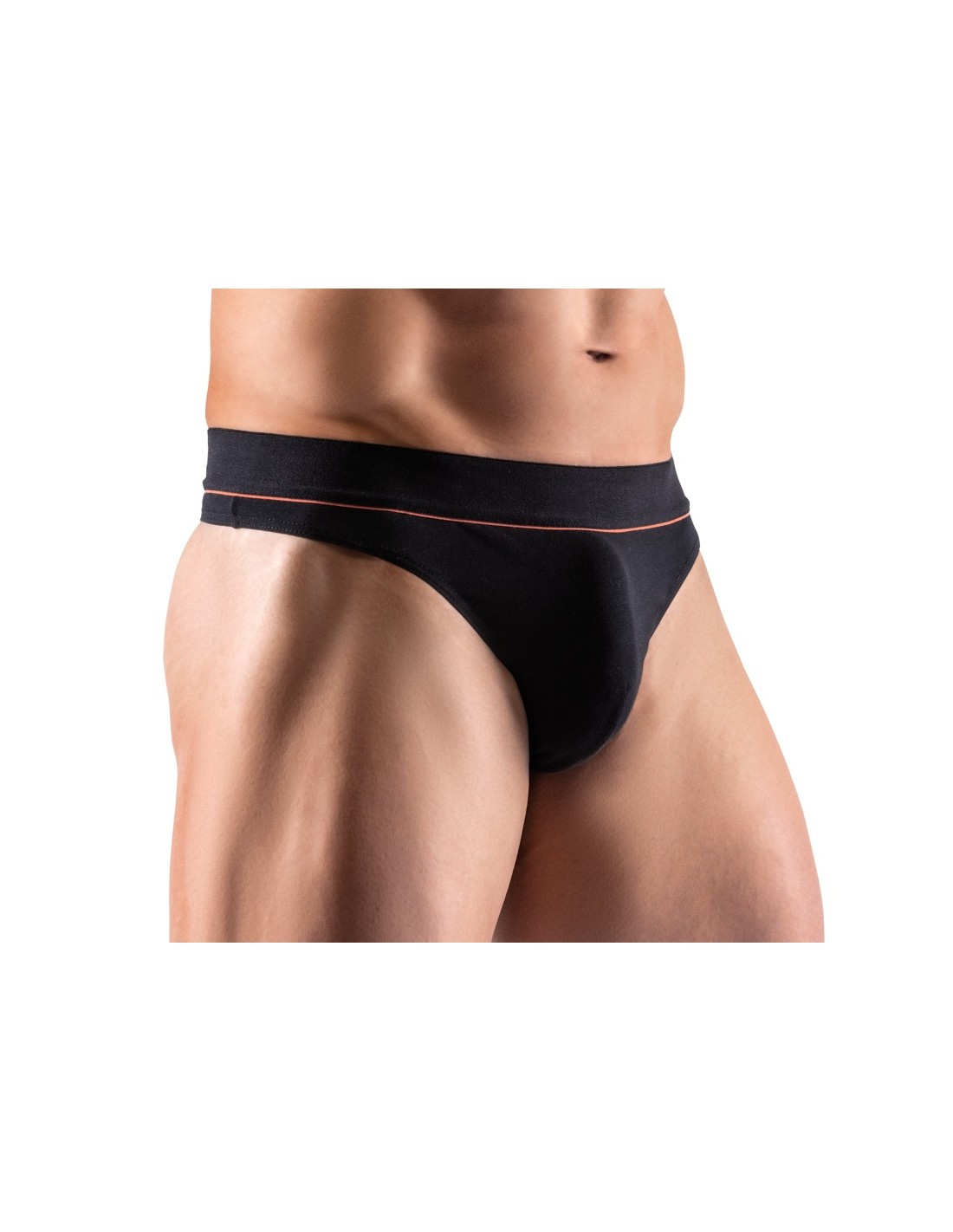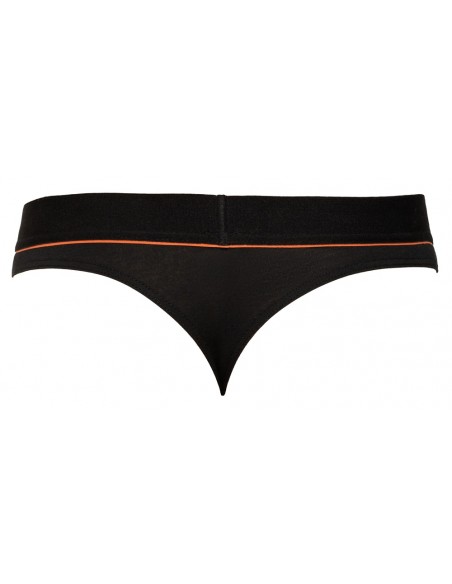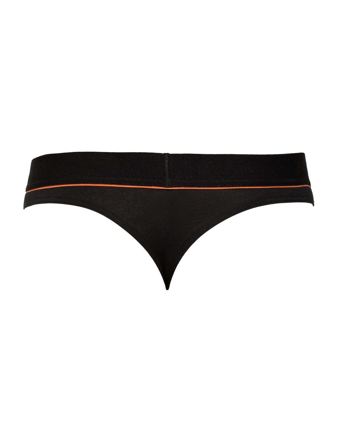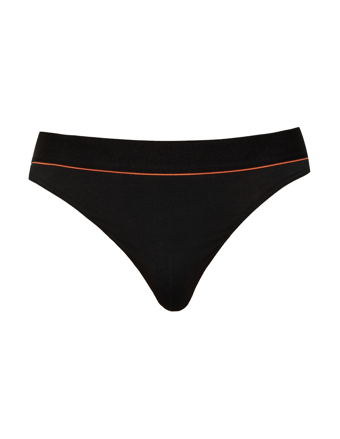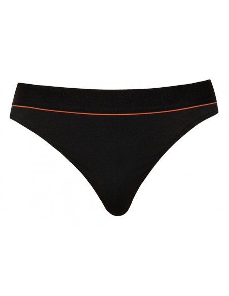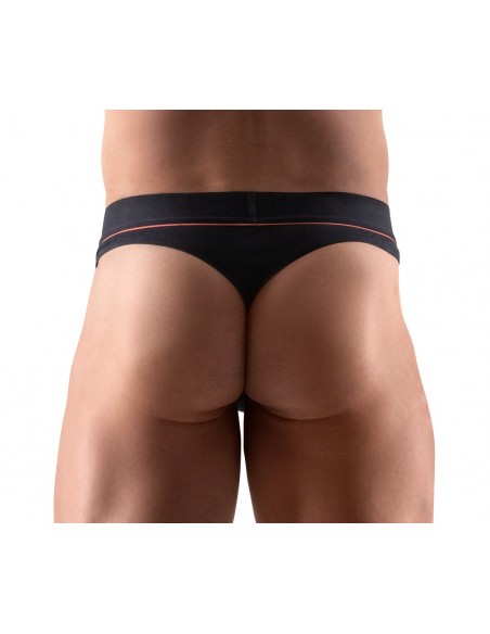 Riostringer nero di Svenjoyment con una vivace striscia rossa sotto la morbida fascia elastica in vita. Sacchetto lavorato a doppio strato. Elevato comfort grazie alla perfetta vestibilità e alla qualità elastica del cotone organico - certificato Oeko-Tex.