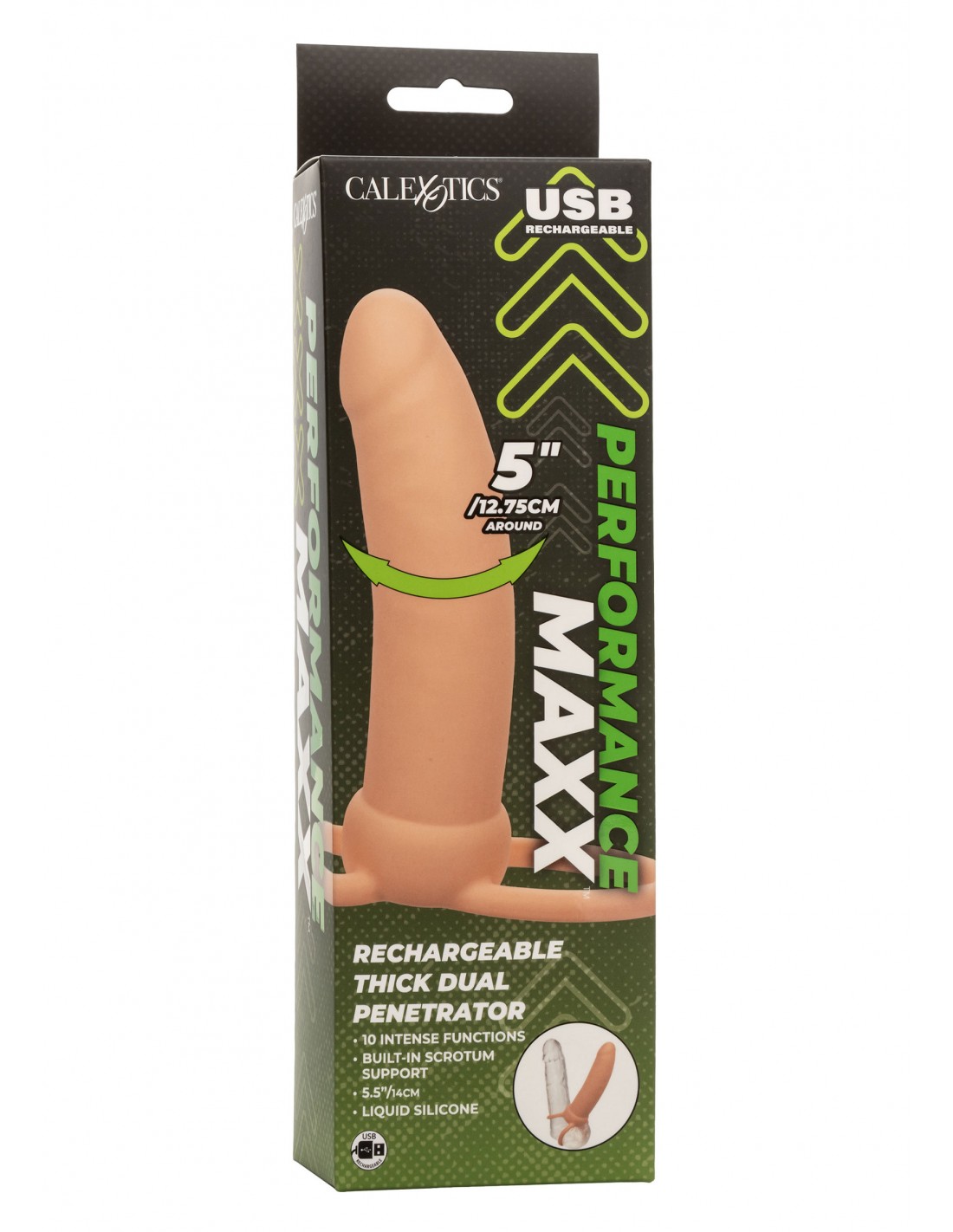 Introduciamo il Performance Maxx Rechargeable Thick Dual Penetrator, una sonda versatile che migliora le esperienze di doppia penetrazione. Ideale per incontri intensi, combina potenza, piacere e comfort, con 10 funzioni di vibrazione, pulsazione e escalation. La sua circonferenza migliorata, con un diametro di 5" / 12,75 cm, intensifica le sensazioni. Realizzato in silicone liquido, è morbido, liscio, resistente e impermeabile (classificato IPX7). L'anello scrotale integrato aggiunge supporto e stimolazione. Per comodità, riprende l'ultima funzione utilizzata e include una funzione di blocco per viaggiare. Ricaricabile tramite USB, si carica completamente in 1,5 ore, offrendo 60 minuti di piacere ad alta intensità o 90 minuti con impostazioni più basse. Sperimenta un piacere profondo con Performance Maxx Rechargeable Thick Dual Penetrator.