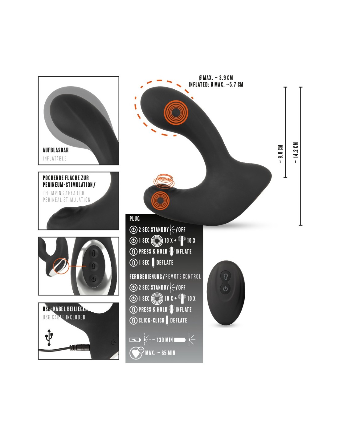 Il plug può essere gonfiato facilmente al tocco di un pulsante - per una sensazione meravigliosamente piena e un perfetto allenamento all'allungamento anale. Con il pratico telecomando, le 10 diverse modalità di vibrazione e picchiettio pulsante, così come la funzione di rilascio della pressione dell'aria, possono anche essere comodamente controllate con il tocco di un pulsante. Con una portata fino a 8 metri, anche dal tuo partner.