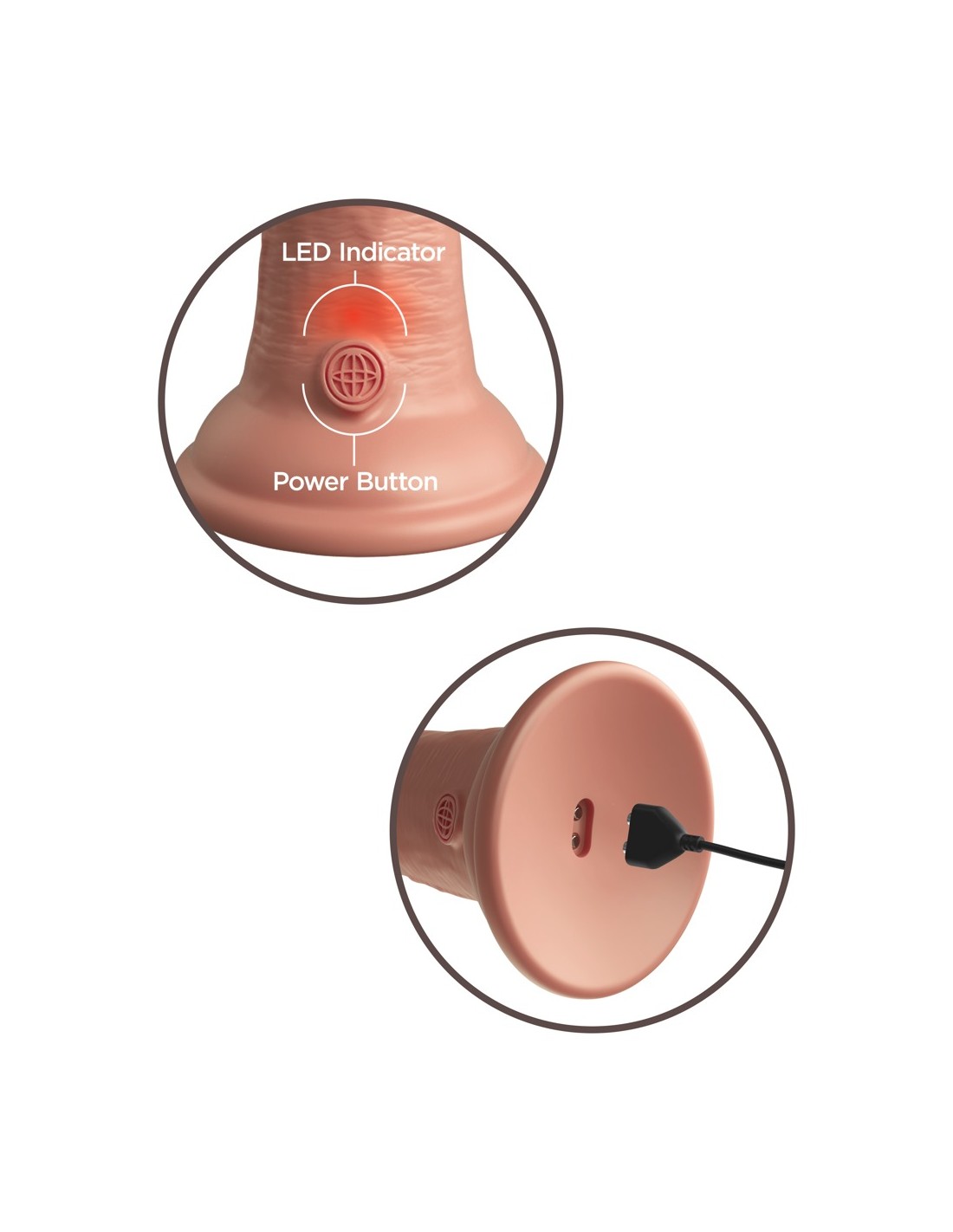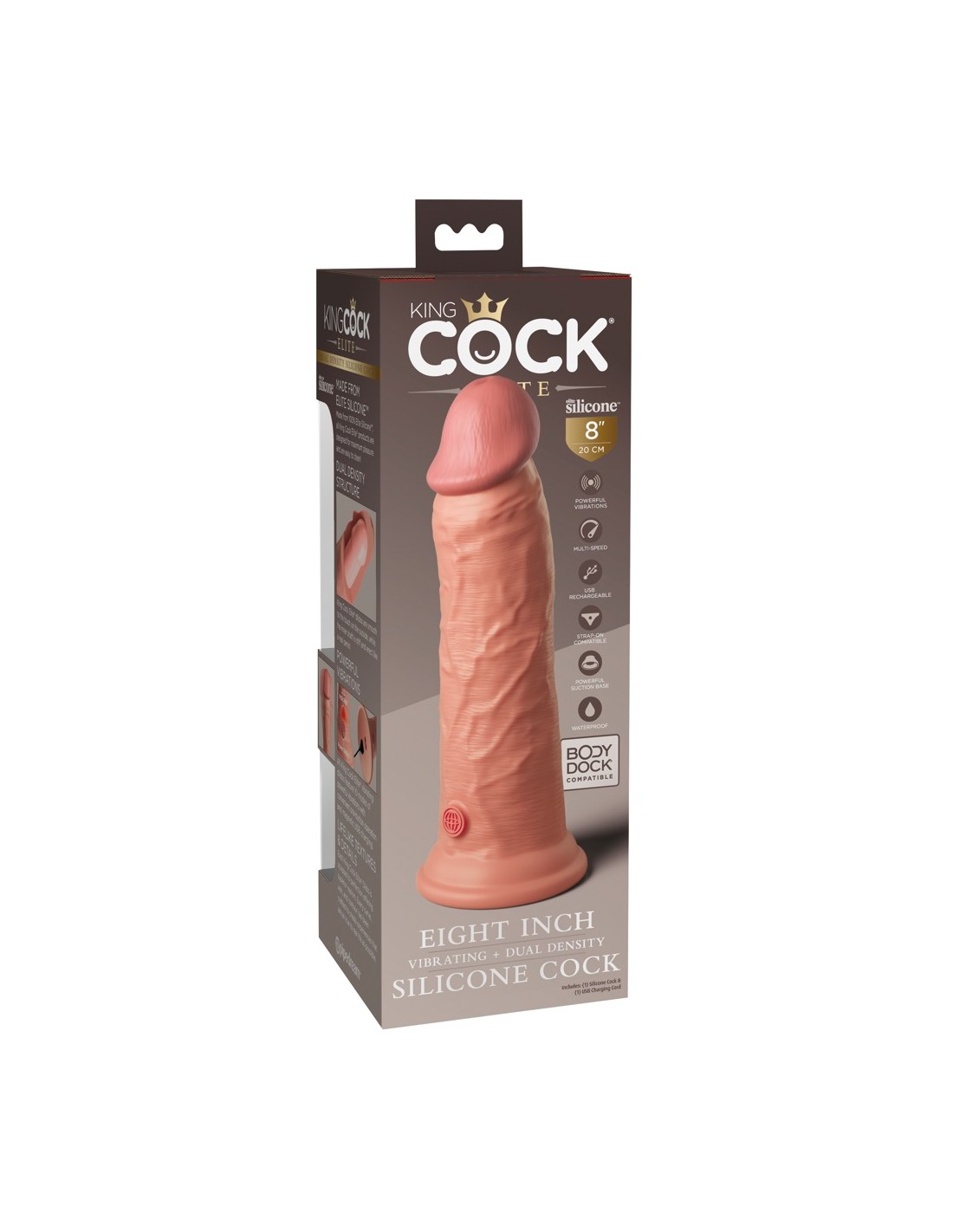 Vibratore naturale ricaricabile 8" vibrante + Dual Density Silicone Cock di King Cock Elite in look iper-realistico del pene fatto di materiale siliconico a doppia densità che si sente come la vera pelle. Il vibratore stesso (come un vero membro eretto) ha un'asta ferma, ma flessibile che rende l'esperienza di piacere il più realistica possibile.